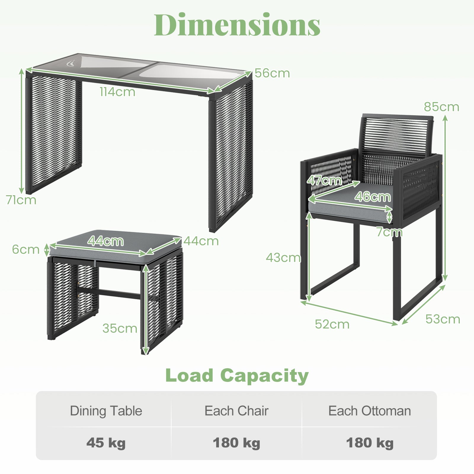 Colour of PE Rattan: Black Colour of Cushion: Grey Material: PE Rattan, Metal, Polyester, Sponge Dimensions of Table: 114 x 56 x 71 cm (L x W x H) Dimensions of Each Chair: 53 x 52 x 85 cm (L x W x H) Height of Seat: 43 cm Size of Each Seat Cushion: 47 x 46 x 7 cm (L x W x H) Dimensions of Each Ottoman: 44 x 44 x 35 cm (L x W x H) Size of Each Ottoman Cushion: 44 x 44 x 6 cm (L x W x H) Load Capacity of Dining Table: 45 kg Load Capacity of Each Chair: 180 kg Load Capacity of Each Ottoman: 180 kg Total Net Weight: 39 kg Box QTY: 2 Package Includes: 1 x Table 2 x Chairs 2 x Ottomans 2 x Seat Cushions 2 x Ottoman Cushions 1 x User Guide