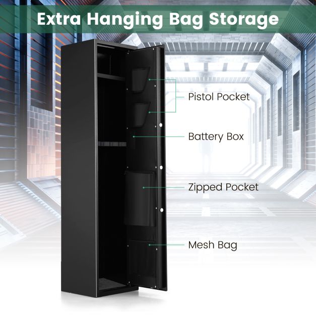 Equipped with advanced biometric fingerprint technology, therifle safe provides 3fast and efficient methods of access, ensuring that your firearms are securely stored away from children and unauthorized individuals.With ample capacity to accommodate up to 5 rifles, the shotgun cabinetboasts a large and deep interior that is perfect for storing firearms of varying sizes. Additionally, the lockbox located on top of the safe provides a separate compartment for storing cash, handguns, and other valuable items, keeping themeasily accessible.Besides, there are pistol pocket and zippered pocket for other valuables. Crafted from sturdy metal, the robust construction of the security cabinet ensures that it remains secure against tampering and unauthorized access. Spacious and Organized Space:The biometric fingerprint safe is capable of accommodating up to 5 rifles. Additionally, the lockbox at the top of the safe provides a separate storage compartment for bullets, jewelry, and other valuables. Also, the zippered pocket and pistol bag will keep your belongings within easy reach. Multi-Access Capability:With biometric technology, the rifle cabinet allows for quick fingerprint recognition, supporting the storage of up to 100 unique fingerprints. For added flexibility, the safe also features a digital keypad that can store 3 to 8 user-defined passwords, along with 2 emergency keys in critical situations. Heavy-duty Anti-theft Frame:Constructed from pry-proof metal, the 5-rifle gun safe boasts a robust frame to safeguard your valuables against unauthorized access. The addition of 5 solid locking bolts will provide reliable protection against theft and tampering. With a silent mode option, you can operate the safe discreetly without attracting attention. Complete Set and Easy Assembly: The firearm security cabinet comes with a comprehensive set of accessories, including 2 Emergency keys, 2 keys for the internal lockbox, 5 anchor bolts and detailed instructions. Thanks to the pre-drilled holes in the back and bottom, the large gun safe can be attached to walls or floors. Protective Feature:Featuring soft mats on the bottom and back of the door, the biometric gun safe ensures that your rifles are well-protected from scratches. Meanwhile, the safe and reliable protection system will provide additional reassurance for your rifles and valuables.