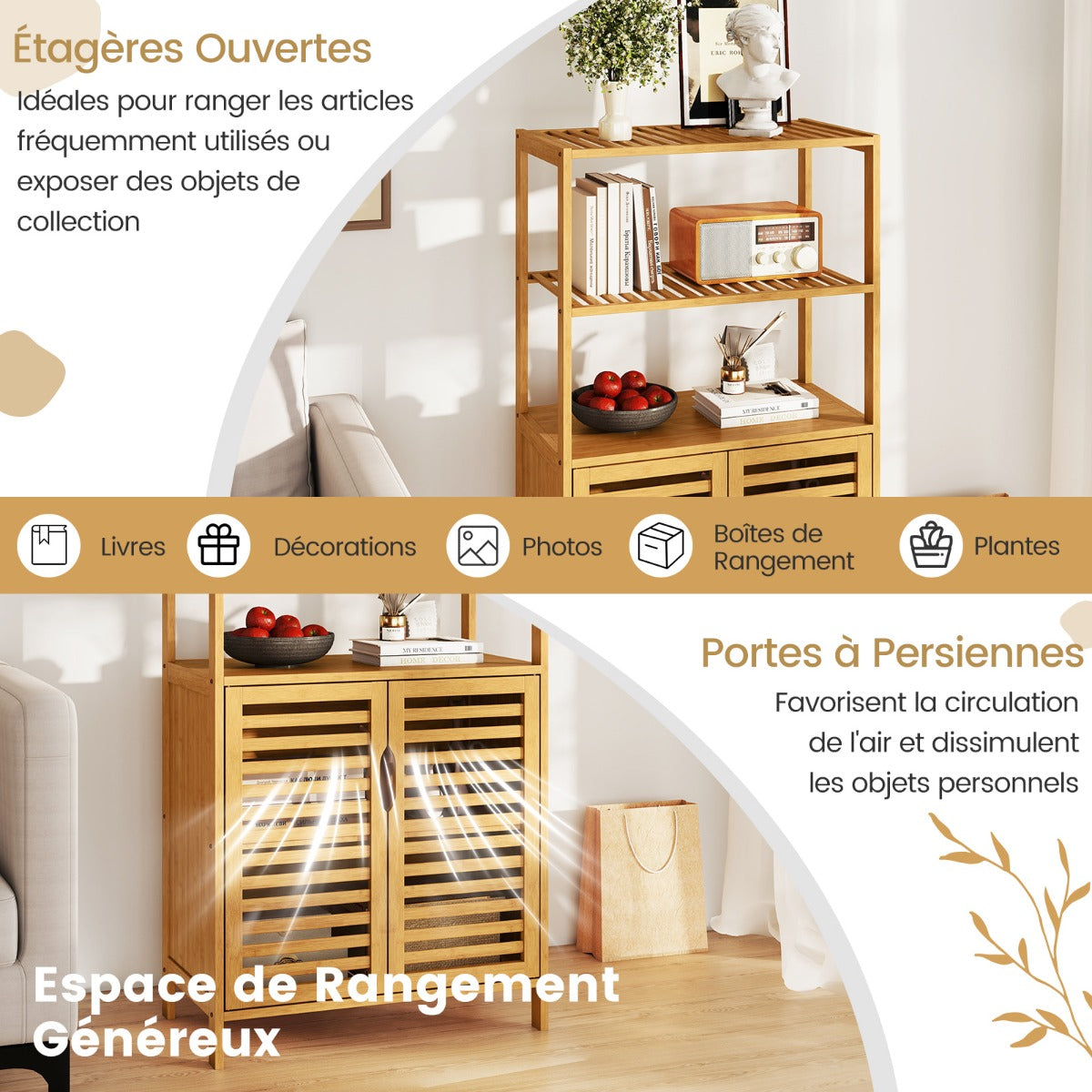 Made of premium bamboo material, this cabinet is built to last while ensuring visually appealing. The open shelves provide ample storage spacefor books, plants, storage boxesand decorative items. Below, a 2-door cabinet is designed to keep your space clutter-free. Safety is a priority with our cabinet that includes an anti-toppling kit. The natural bamboo finish brings an airy feel to any interior setting, be it in the living room, study, kitchen, or office. Bullet Point: High Quality Bamboo Cabinet:Crafted from natural bamboo material, known for its high strengthand durability, the cabinet is a reliable addition to your home. Additionally, the well-polished surface allows for easy maintenance. Open Display and Storage Space:With 3 spacious shelves and 2-door cabinet, the bamboo cabinet is ideal for storing frequently-used items or displaying collectibles. The open shelving design also provides easy access for supplies. Louvered Doors:The cabinet features 2 louvered doors to keep items tidy and out of sight, while promoting better ventilation. To enhance convenience, the cut-out handles and magnetic catches ensure easy opening and closing of the doors. Stable and Secure Design:The anti-toppling kit firmly secures the display cabinet to the wall to ensure stability and peace of mind. Additionally, non-slip foot pads enhance stability and protect your floors from scratches. Versatile Storage Solution:Whether used in the living room, study or storing kitchen essentials, this freestanding storage organizer is versatile enough to fit different needs. Its clean lines and natural appearance seamlessly integrate into any room style.