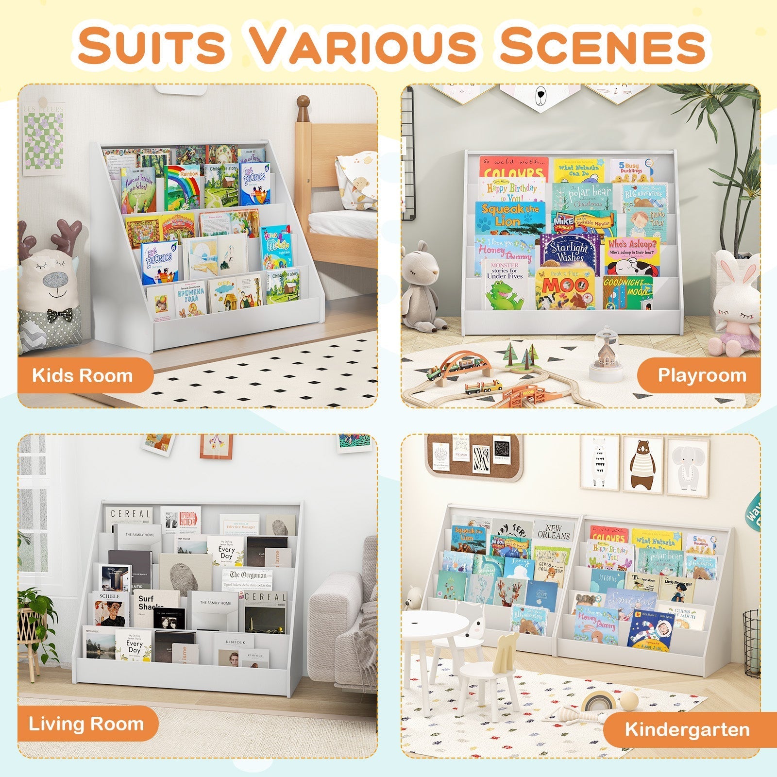 This bookshelf is thoughtfully designed to accommodate those large format books. Its child-friendly height allows even the youngest readers to reach for their favorite stories confidently. With its front-facing display, it's like a little shop window, enticing children to dive into the pages of their books. For safety concerns, this book case comes with wall-mounting options for added stability and anti-slip foot pads to keep it firmly in place. A versatile piece, it can transform any corner in homes or nurseries into a cozy reading nook, or double as a magazine rack for grownups. Bullet Point:Large Capacity: This kids' book shelf features 5 deep and lengthy tiers, offering ample space for large format books like picture books, bedtime stories, comics and albums. Your little ones can learn to keep their books and magazines tidy, and develop a good reading habit at an early stage of their growth.Kids-Oriented Designs: With its height of 76.5 cm, this children's book display shelf is easily accessible for toddlers. It also features a front-facing display, offering a clearer view compared to traditional spine-facing shelves, thereby encouraging toddlers to read more often and choose their own reading materials.Enhanced Stability: For secure placements, this kids' bookcase can be mounted to the wall through included anti-toppling devices. It also comes with anti-slip foot pads, which provide added stability and floor protection, enhancing its use in busy modern families with pets or young kids.Safety Promoted: This floor book rack is crafted from child-safe materials, so that parents can rest assured knowing kids are reading in a healthy environment. Its surface are carefully polished, and the edges are rounded to reduce the risk of bumps, safeguarding your active little explorers.Suits Various Scenes: This children's book rack, measuring 91 x 38 x 76.5 cm (L x W x H), is ideal for establishing a snug reading corner in kids' rooms, playrooms, and also in nurseries and classrooms. Additionally, it can be utilized as a small rack for magazines by your bed or sofa, all to your likings. Specifications:Colour: Grey/Natural/WhiteMaterial: Engineered WoodProduct Dimensions: 91 x 38 x 76.5 cm (L x W x H)Dimensions of Each Shelf: 88.5 x 5.5 x 9 cm (L x W x D)Suitable Age: 3+Net Weight: 17.6 kg Package Includes:1 x Kids' Bookshelf1 x User Guide