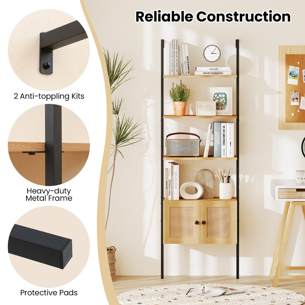 5-Tier Ladder Bookcase with Rattan Cabinet and Metal Frame-Natural