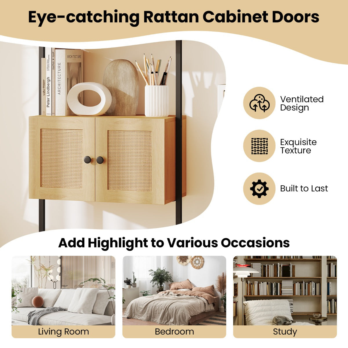 Thanks to double anti-tipping design, the ladder bookcase can be securely fastened to the wall. The blend of open shelving and enclosed storage cabinet makes this piece suitable for multiple uses from a book display to an organizational hub. Constructed with a sturdy metal frame, this wall-mounted bookshelf is built to last and hold a variety of items securely. Moreover, the eye-catching rattan cabinet doors add highlight to various occasions, either for home and office. Bullet Point: Secure Wall-Mounted Bookshelf: This ladder bookcase is equipped with2 anchoring points and anti-tip fittings for secure wall attachment. The design, when wall-mounted, ensures a sturdy and stable structure, providing peace of mind. Open andEnclosed Storage Space:With 4open shelvesand a double-door cabinet, this wall-mounted bookshelf providesstorage and display space for books, ornaments, or potted plants. Standing tall at 184cm,it maximizes vertical space in your home. Reliable Construction:Crafted from powder-coated metal frame, this 5-tier bookcase with cabinet ensures great sturdiness and stability. Besides, the thickened boards ensure durability and long-term use Chic PE Rattan Embellishment: The boho open display shelf brings a warm and natural touch to your living room, study, or office. In addition, the PE rattan front doors on the lower cabinet offer a stylish and textured appearance that complements various home styles. Practical Features:The easy-to-use knobs and soft-close hinges ensure effortless opening and closing of cabinet doors. Moreover, the cabinet sits 29cmabove the floor, simplifying floor cleaning tasks. Specifications: Color: Natural Material: Engineered Wood, Metal, PE Rattan Overall Dimensions: 60 x 31.5 x 184 cm (L x W x H) Inside Dimensions of Cabinet: 53 x 29 x 29.5 cm (L x W x H) Space Between Cabinet and Ground: 29 cm Dimensions of Shelf: 56 x 29 cm (L x W) Space Between Shelves: 29.5 cm/30 cm/31 cm Weight Capacity of Each Shelf: 15 kg Net Weight: 14 kg Box Qty: 1(May vary by batch) Package Includes: 1 x Ladder Bookshelf with Cabinet 1 x Instruction Manual