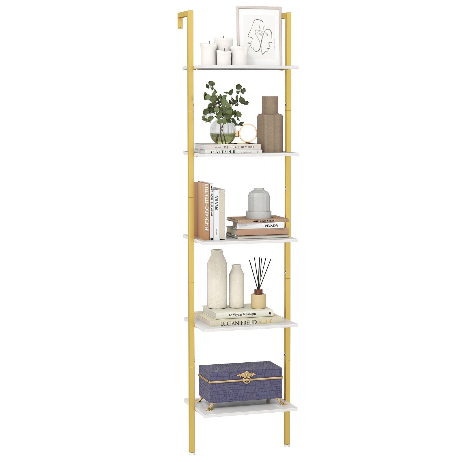 5-Tier Ladder Shelf Wall Mounted Bookshelf with Metal Frame-White & Golden