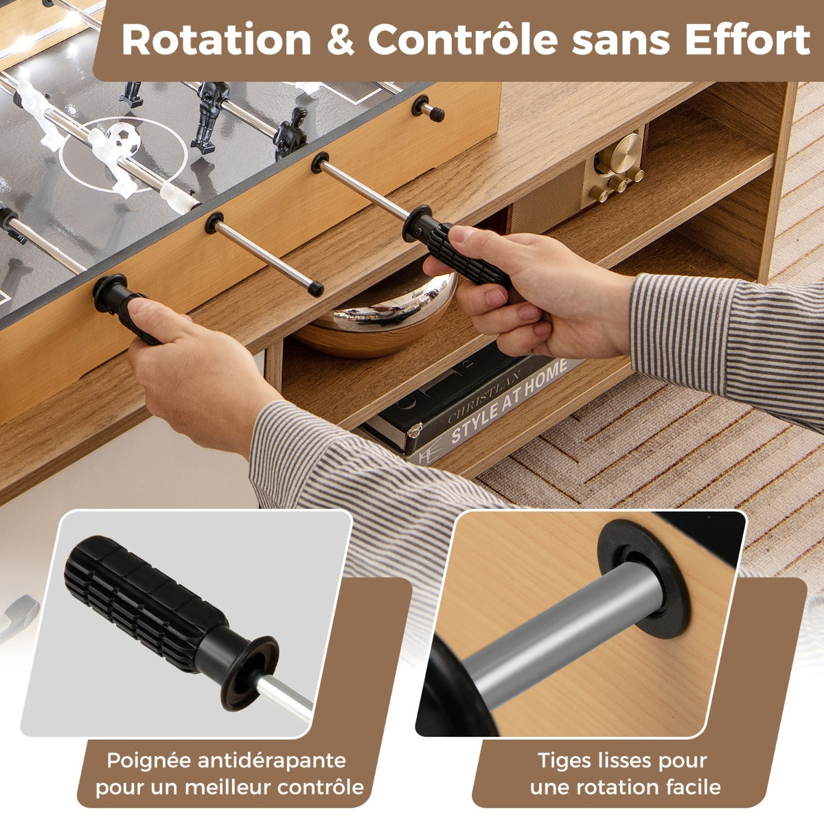 This football game tableintegrates dazzling LED lights to illuminate play, making each match more exciting. Featuring realistically designed players, 2 ballsand anti-slip handles, the foosball tableensures enjoyable and controlled gameplay for everyone.The compact and lightweight design makes it suitablefor varying spaces, such as theliving room, play room, party, office and more. This foosball tableserves as an inviting centerpiece for gatherings, creating memories and fostering friendly competition among kids and adults alike.Invite your friends and family to join in the fun! Light upGame Night: There are bright LED lights on both sides of this football game table, addinga dynamic and exciting ambiance to gameplay. Please note: the lights require 3 AAbatteries (not included). Ultimate Game Experience: This foosball table is equipped with 12realistic playersand 4 non-slip handles, ensuringbetter grip during fast-paced games and providing an authentic gaming experience. Compact Size andWide Application:This 51cmcompact foosball table is an ideal choice for homes, offices, or any area with limited space, allowing kids and adults to enjoy the game without taking up too much room. Complete Foosball Game Set:In addition to the realistic players and handles, this soccer game table comes with 2 balls, 2 manual scorers and 2 goal boxes, allowing you to dive into the excitement immediatelywith friends or family. Ideal Gift Choice:Thisfun family foosball gametable isperfect for all ages.It not only provideslong hours of fun, but also helps to promote hand-eye coordination, parent-child interaction and more.