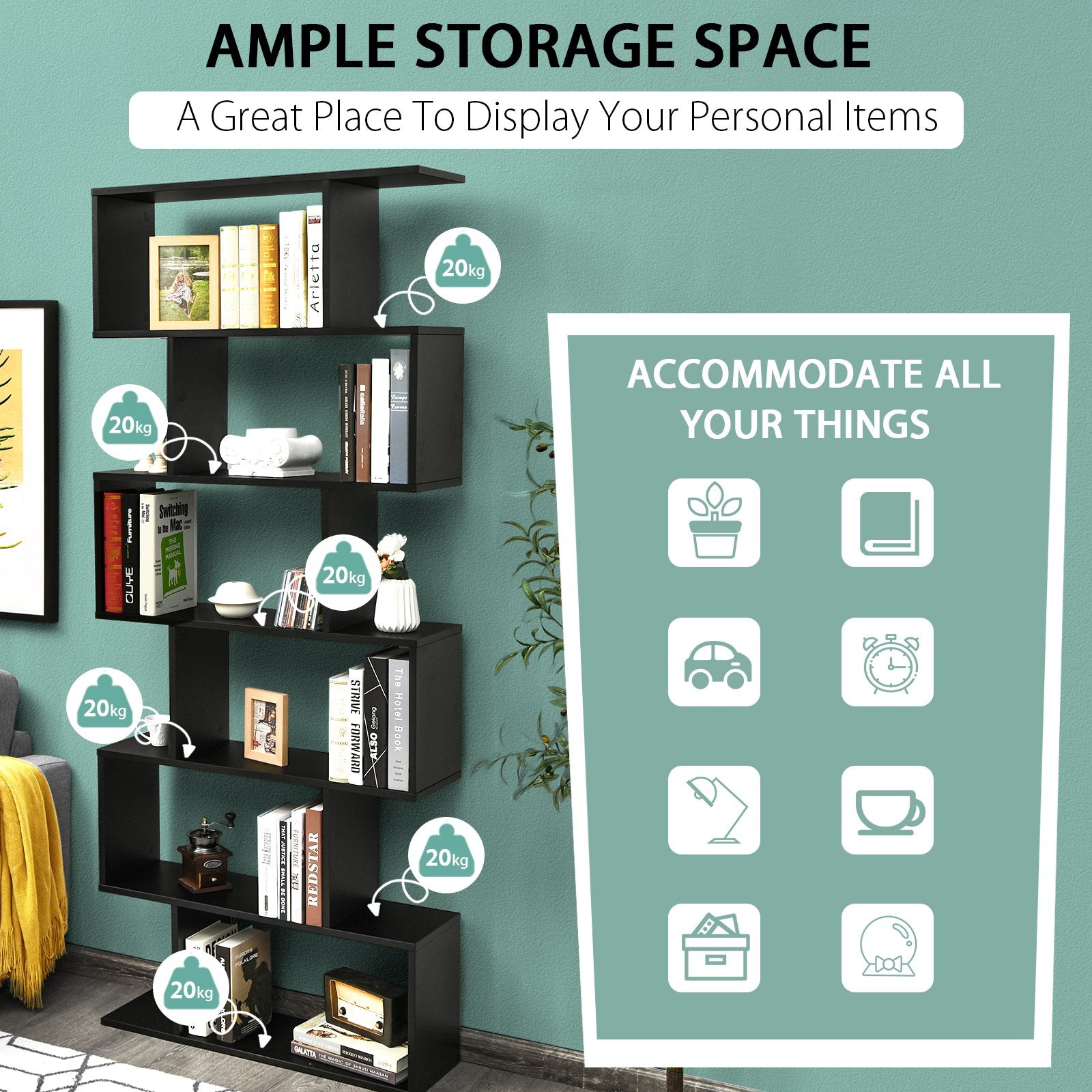 6-tier S-shaped Wooden Industrial Bookshelf-Black