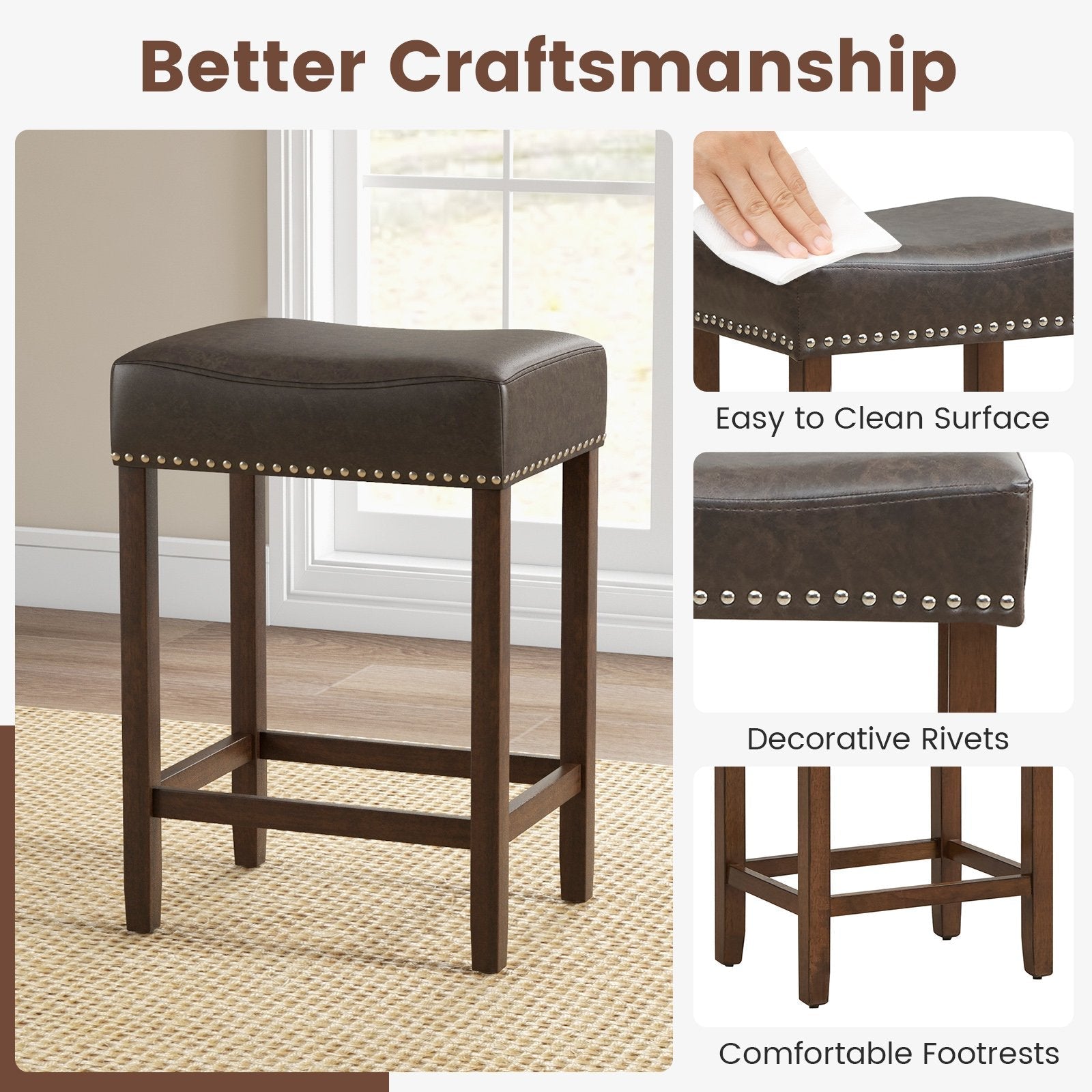 Experience unrivaled comfort and support with the ergonomic saddle bar stools! Designed with a saddle-shaped seat for ultimate relaxation and improved posture, you’ll feel like luxurious comfort as you sit back and relax. Crafted with skin-friendly PU leather and high-density sponge, every seating experience is a plush one. The pub stools are built to last with solid rubber wood legs that can handle a considerable weight, while non-slip foot pads ensure stability, perfect for those endless hours spent chatting with friends. With rivet accents adding a touch of sophistication, these kitchen stools offer a versatile and elegant design. Plus, enjoy enhanced comfort with the sturdy footrest. Say goodbye to hassle as the easy-to-clean PU leather seat guarantees a fuss-free maintenance routine. Get ready to transform your space with style and comfort now! Ergonomic Saddle-shaped Seat: The saddle seat design of these pub stools provides optimal support and promotes proper posture. With skin-friendly PU leather and high-density sponge, it offers a plush and comfortable seating experience. Solid Rubber Wood Legs: Featuring solid wood legs, these saddle seat bar stools boast long-lasting durability and large weight capacity. Furthermore, the legs are fitted with non-slip foot pads for enhanced stability, making it ideal for extended use. Versatile and Elegant Addition: The rivet accents not only help secure the upholstery, but also bring a sense of sophistication. Along with a sleek and elegant design, the kitchen stools add a touch of elegance to the space. Pleasant Detail Design: The kitchen island stools are equipped with sturdy footrest, allowing you to relax and enjoy your meals or drinks in utmost comfort. More details, like the proper seat height, bring the convenience to match most counters. Easy Assembly and Maintenance: With clear instructions and all necessary hardware included, assembly is a breeze. Additionally, the PU leather seat is easy to clean and maintain, ensuring hassle-free upkeep for years to come.