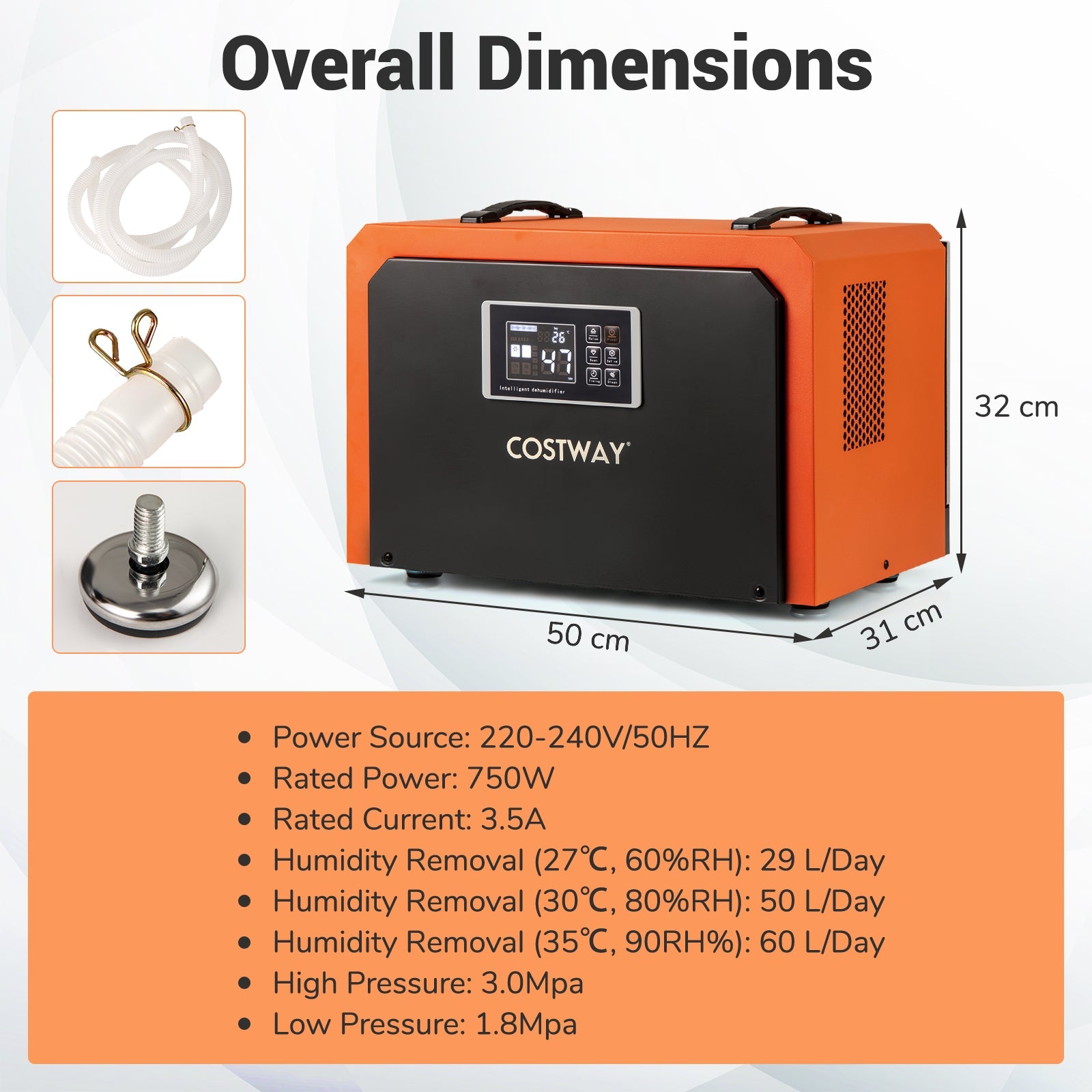 Colour: Orange Material: Cold-rolled Sheet, Aluminum, Rubber, ABS, Copper Overall Dimensions: 50 x 31 x 32 cm (L x W x H) Power Source: 220-240V/50HZ Rated Power: 750W Rated Current: 3.5A Humidity Removal (27℃, 60%RH): 29 L/Day Humidity Removal (30℃, 80%RH): 50 L/Day Humidity Removal (35℃, 90RH%): 60 L/Day High Pressure: 3.0Mpa Low Pressure: 1.8Mpa Length of Drain Hose: 204 cm Max. Coverage: 560㎡ Airflow: 450m³/h Net Weight: 23 kg Box Qty: 1 (May vary by batch) Package Includes: 1 x Dehumidifier 1 x Drain Hose 1 x Instruction Manual