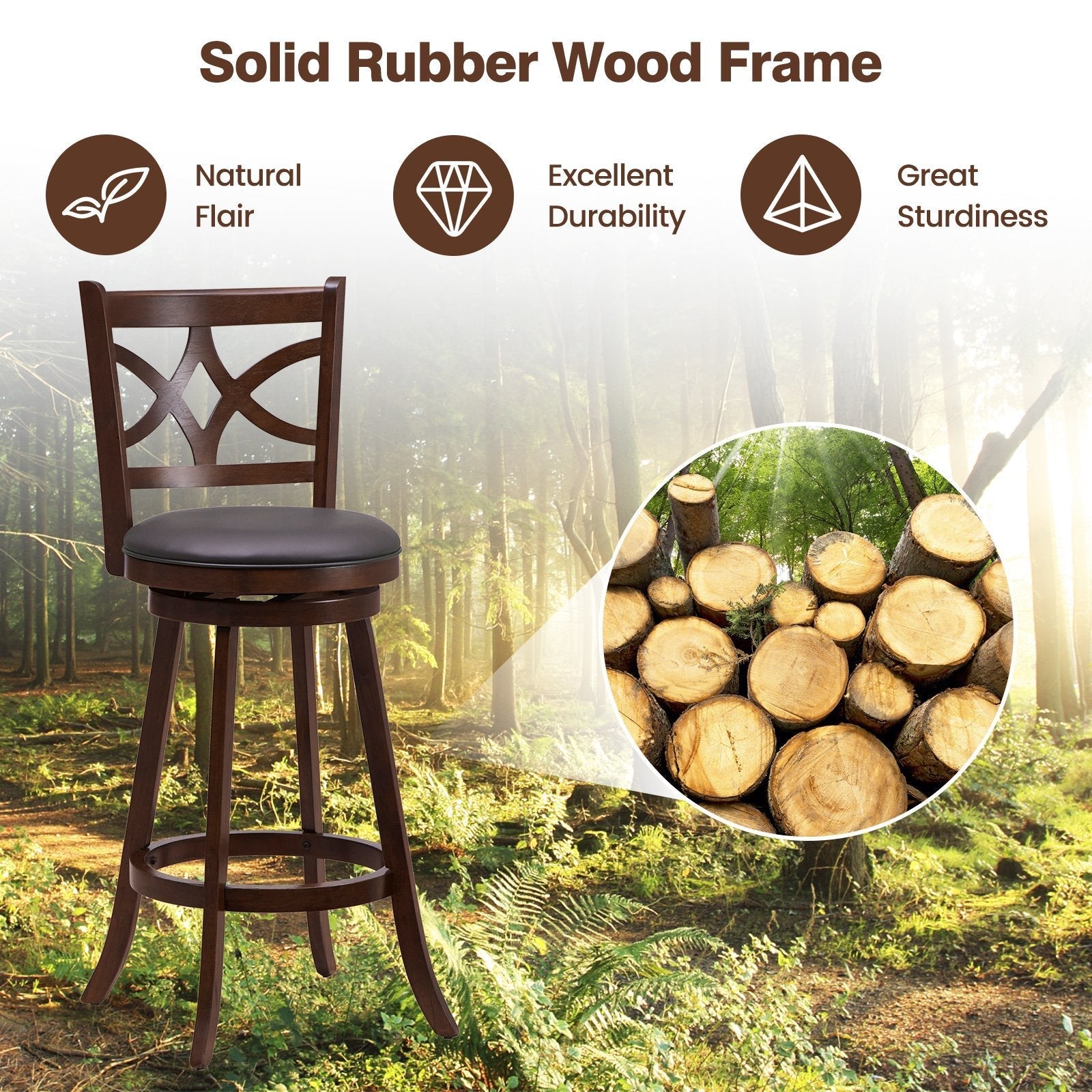 Crafted from solid rubber wood, the bar stool set is designed with sturdy and stable support and is not easy to crack. 360° swivel design can maximize your comfort and give you or your guest the freedom of rotation for easy communication. Ergonomic design with curved backrest, sponge-filling seat, and footrest provides more support for your body while sitting, making it relaxing and safe at the same time. A great combination of elegant simple beauty and versatility to add elegant style to your room! If you are looking for a bar stool set like this, do not hesitate to place an order! Selected Rubber Wood Frame: Constructed of solid rubber wood frame, the counter/bar height stools boast exquisite craftsmanship, and they are steady and strong enough to bear a great capacity of up to 120 kg. 4 stable inclined legs also ensure sturdy and stable support. Ergonomic and Comfy Bar Stools: The bar chair features PVC seat cover with thick soft sponge padding, providing maximum comfort as well as giving you a great sitting experience. The ergonomic design with curved backrest can make you relaxed with lumbar support and hip support. 360-degree Swivel Design: Designed with a 360-degree swivel design, the bar stools allow you to freely turn to any direction you desire and make dining and socializing easy. The 61cm /74cm seat height barstools can fit 89-99cm/101-110cm different counter and bar heights for your proper and comfy use. Humanized Footrest and Easy Setup: This bar stool is equipped with a 17.5cm/24.5cm high footrest that enables you to freely stretch your legs and find the comfiest sitting position. Understandable installation guide can help you easily install the set. The pattern of the back has a decorative effect, and also helps to pull the chair out. Vintage for Various Uses: With a beautiful but elegant appearance, the upholstered barstools combine decoration and function, which will be a great addition to your dining room, kitchen, bar, cafe, bistro, restaurant to match with any home decor.