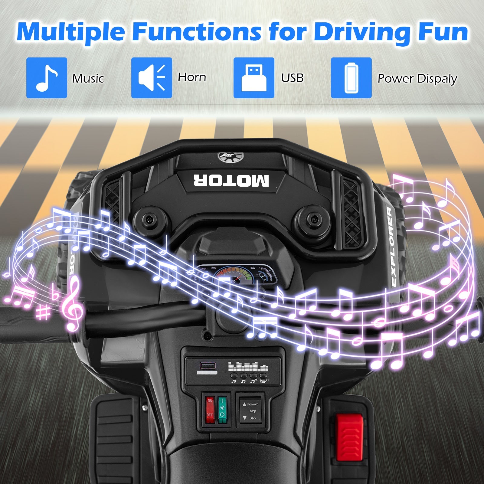 Our 6V motor-powered electric car offers a thrilling 2 km/h top speed, perfect for young adventurers. It's equipped with premium tires that handle various terrains, from concrete to tile roads, ensuring a smooth ride. The exciting music function with three built-in songs and a horn, along with a USB slot for additional tunes, provides a musical journey that's both fun and volume-adjustable. For an extra splash of joy, the unique spray function adds a colorful, vibrant element to every ride. Style and practicality meet in this electric toy car, featuring bright headlights, stylish patterns, and a useful storage box for small toys or books. As a perfect gift for kids 18 months and older, it promotes healthy exercise, hand-eye coordination, and a break from screen time, making it an ideal choice for parents seeking a gift that's both enjoyable and beneficial. If you are looking for such a product, do not hesitate to buy it! High-Performance Kids Ride-on Car: Equipped with a 6V motor and 6V 4.5 AH rechargeable battery, this kids electric car offers a top speed of 2 km/h for kids to experience an exciting journey. The premium tires fit various surfaces, including concrete road, board walk, rubber track, and tile road. Exciting Music Function: This kids toy ATV comes with 3 different songs and a horn sound, allowing your child to enjoy endless fun on the go. And kids can press and hold to lower or increase the volume. Plus, the USB slot allows for additional music, making every ride a unique musical adventure. Unique Spray Function: Add water to the included funnel and watch as your child enjoys the colorful spray effect while driving. This unique feature adds an extra layer of fun to their playtime, turning every ride into a vibrant and exciting experience. Cool & Practical Designs: This electric toy car features stylish pattern decorations and a bright headlight for visibility during outdoor play. The useful storage box provides extra space for small toys or books, making it a practical toy for everyday use. Plus, it also comes a battery status indicator for your convenience. Perfect Gift for Kids: Featuring a premium foot pad and a convenient control panel, this ride-on car allows kids to enjoy a real driving experience for your kids. It is a kind of healthy fun exercise, that enhances kids’ hand-eye coordination, release pressures and encourages them to get away from TV.