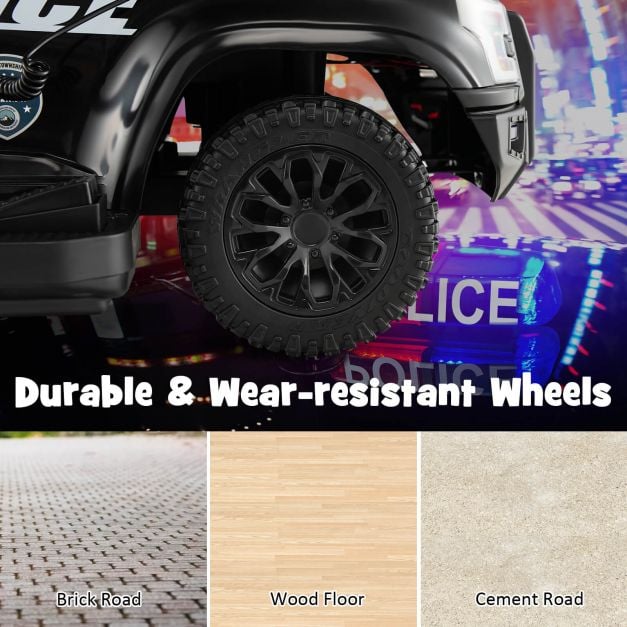 Lifelike warning lights, siren sounds and megaphone design ensure an enjoyable riding experience. 6V rechargeable battery and built-in strong motor ensure a safe speed of 1.86 mph. Besides, with 4 durable wheels, kids can ride on wood floor, cement road, brick road and more. And its hidden storage offers kids more space to store their books, snacks and toys. To guarantee kids' safety, we design it with a bottom anti-tilt device and a safe backrest. ASTM and CPSIA certifications also adds more security. The spacious seat and wide footrest keep it comfortable to ride. What's more, this electric vehicle offers kids driving fun and promotes their motor skills as well as hand-eye coordination. If you are looking for such a product, do not hesitate to buy it! Cool and Fun Police Car: Designed with delicate police car stickers, flashing warning lights and a megaphone design, this ride on police car makes kids feel like a real policeman. And kids can push the red button of the megaphone to amplify their sounds through the megaphone, adding more fun. Control Panel and Hidden Storage: Multimedia player provides kids with more riding joy. An extra USB port and TF interface enable it to connect with external devices for more music. Apart from that, under-seat storage enables kids to store their toys, snacks and other small items. Safe and Comfortable Design: This toddler riding toy features bottom anti-tilt device and safe backrest to avoid kids' leaning back and better ensure their safety. It also has passed ASTM and CPSIA certifications, guaranteeing higher security. In addition, comfortable seats and wide footrests allow your kids to ride comfortably. Realistic Driving Experience: With a 6V rechargeable battery and a built-in strong motor, this toy police car can reach a safe speed of 1.86 mph. On the other hand, with durable and wear-resistant wheels, this riding toy is suitable for different road conditions, such as wood floor, cement road, brick road and more . Perfect Gift for Your Toddlers: This police car with a cool outlook is an ideal gift for 18-60 months old kids. The seat can hold a weight of up to 25 kg. Kids can not only acquire happiness but can also exercise their balance ability, motor skills and hand-eye coordination during the playing process.