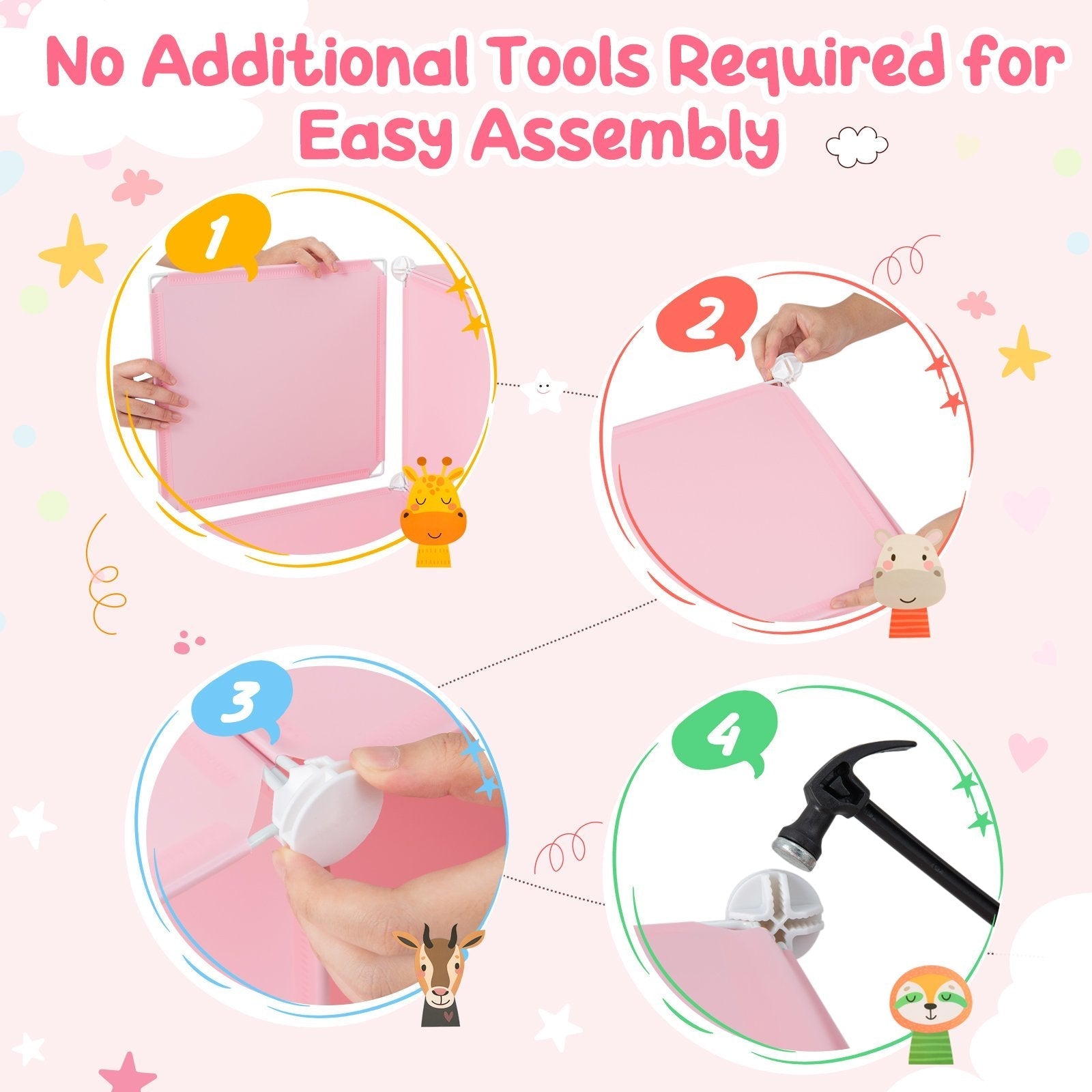 If you always have baby's clothes or toys cluttered here and there, this 8/12-cube storage organizer will be a good solution. First and foremost, the kid's room armoire features plenty of storage space to hold the sundries and keep the room clean. There's even a hanging section for baby's clothes. What's more, it can be freely combined according to specific needs, being used separately or be stacked for narrow corners. Usually it is combined for larger space. And the 2x4 cube organizer has cute patterned doors, which not only hide the mess, but also decorate the space. And tool-free assembly means you can easily put the wardrobe together without professional skills or technical tools. Secret of a Tidy Nursery: The kids wardrobe consists of 8/12 storage cubes and 1/2 hanging poles, providing ample storage space and hanging area for children's clothes, shoes, toys, books and other sundries. And each cube is fitted with a door, which helps to hide the mess from sight. DIY the Storage Space: You can freely arrange the cubes according to your needs, either use them separately or stack them together for a larger space. Besides, you can decide where to fix the hanging pole, thus to change the position of hanging area as needed. High-quality PP Material: The kids clothes closet is mainly made from premium PP material, which is odorless and non-toxic for nursery use. Meanwhile, the PP panels are lightweight, making the whole baby dresser portable and easy to move. User-friendly Design: The cute animal patterns on the doors will catch children's eyes and win their heart. It is not only a handy storage organizer, but also an adorable decoration for kid's room, playroom and living room. What's more, the smooth and waterproof surface makes daily cleaning a breeze. All-included Package: The package includes 29/41 square panels, 8/12 door panels, 32/44 connectors, 1/2 hanging poles and a mallet. You can check the accessories first and then follow the instruction step by step. No other tool is required. It is quite easy to put the cube organizer together!