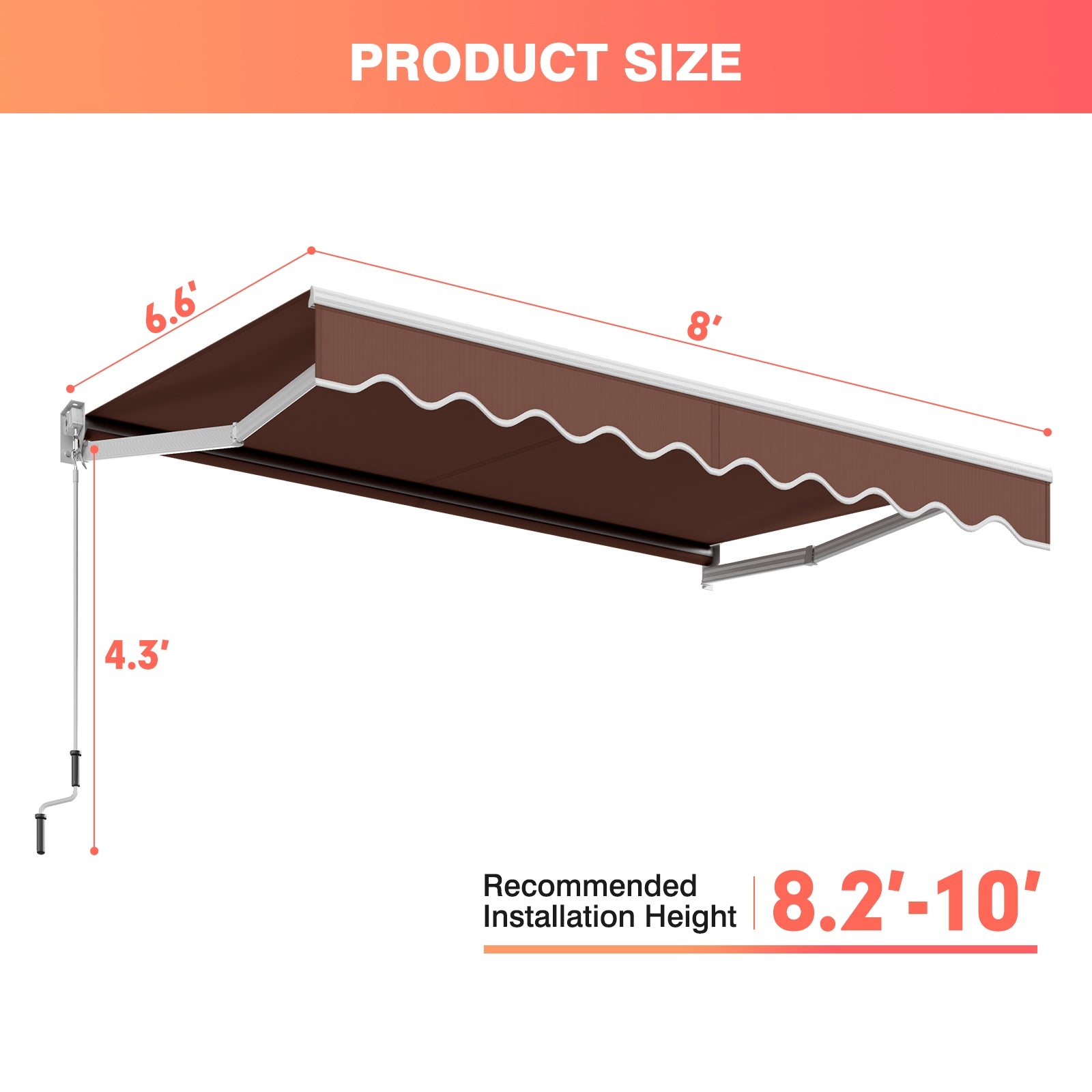 This retractable awning is a perfect shading choice for you! Do you want to enjoy a leisurely time outdoors on a clear day, but worry about harsh sunlight? This 8' x 6. 6' awning can be tilted from 40-100°, providing better protection for you from UV damage according to your needs. In addition, the built-in easy-to-operate crank can easily control the opening of the awning. The retractable awning features a powder-coated aluminum alloy and steel frame for higher stability and durability. And the canopy is made of 280g polyester fabric, which is waterproof, anti-fade, and wear-resistant for easy cleaning and maintenance. With a decorative wavy edge, these awnings are suitable for installation in patios, balconies, restaurants, etc. If you are looking for such a product, do not hesitate to buy it! Convenient to retract and open the awning with a manual crank handle Waterproof and wear-resistant polyester fabric ensures its durability UV proof canopy protects your skin from the sun Compact size fit for various cement and brick walls Powder-coated coating is not easy to rust and is stable The canopy can be tilted from 40-100°by adjusting the screw Beautiful wavy edge makes it a good decor in many outdoor spaces Recommend installation height: 8.2-10 feet Easy to install with a clear instruction manual Provide an 8' x 6.6' spacious shading area for you