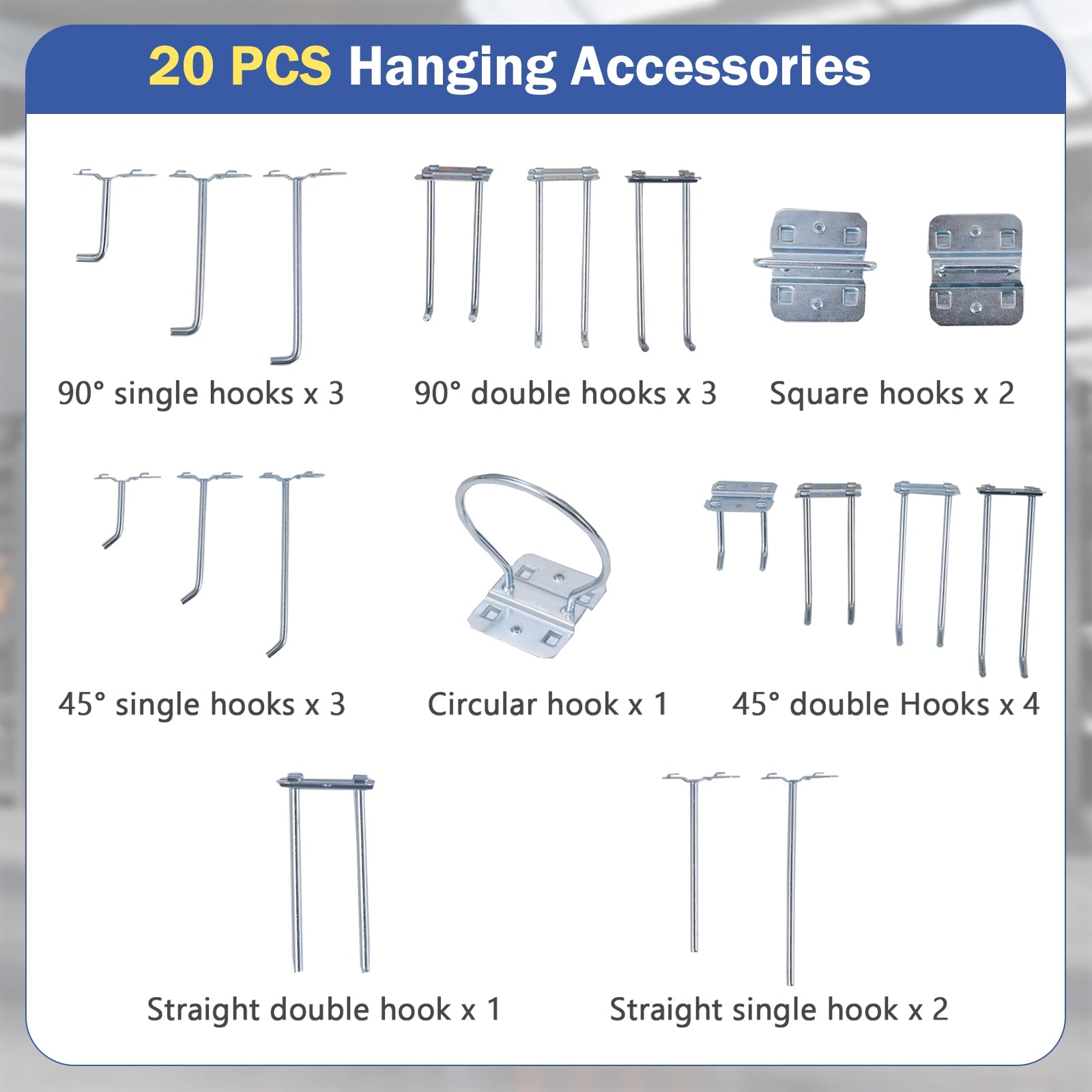 The work table comes equipped with multiple storage options including a top shelf, 2 pegboards, a spacious tabletop, a large drawer, and a two-tier shelf. Mainly made of anti-deformation metal, it can hold heavy weight for most works. Additionally, the pegboards feature precisely arranged square holes for increased tool stability, and it includes 19 varied hanging accessories for optimum organization. Suitable for both professional and home settings, whether for crafting, repairs, or DIY projects, this workbench is designed to meet a wide array of needs, ensuring it is a valuable addition to any workshop or garage. Ultra-Strong Workbench: With reinforced metal construction, this 81 x 41 cm work table supports 290 kg totally, making it available for most heavy-duty works, which ensures stability and longevity in any challenging workshop environment. Perfect Tool Organizer: Featuring 1 top shelf, 2 pcs pegboards, a spacious tabletop, 1 large drawer and 2-tier shelf, the workbench will keep your workspace organized and efficient. All your tools, such as electric drill, drill bit and tool box, will be well classified, making every task more manageable and less time-consuming. Pegboard with Square Holes: This work table is complete with 2 pieces of functional pegboards which offer extra storage space. The orderly arranged hanging holes on the pegboards are precisely crafted with square shape for higher stability. 19 PCS Hanging Accessories: The workbench comes with 19 pieces of hanging hooks in different shape (single/double/square/circular) and tilt angles (90°/45°/straight). Therefore, you can hang multiple tools onto the pegboard, such as wrenches, screwdrivers and so on. Wide Range of Applications: Designed not just for professional workshops, this well-designed workbench is also suitable for home and garage use. Whether you’re crafting, repairing, or conducting DIY projects, this work table meets a broad spectrum of needs, enhancing productivity and efficiency.