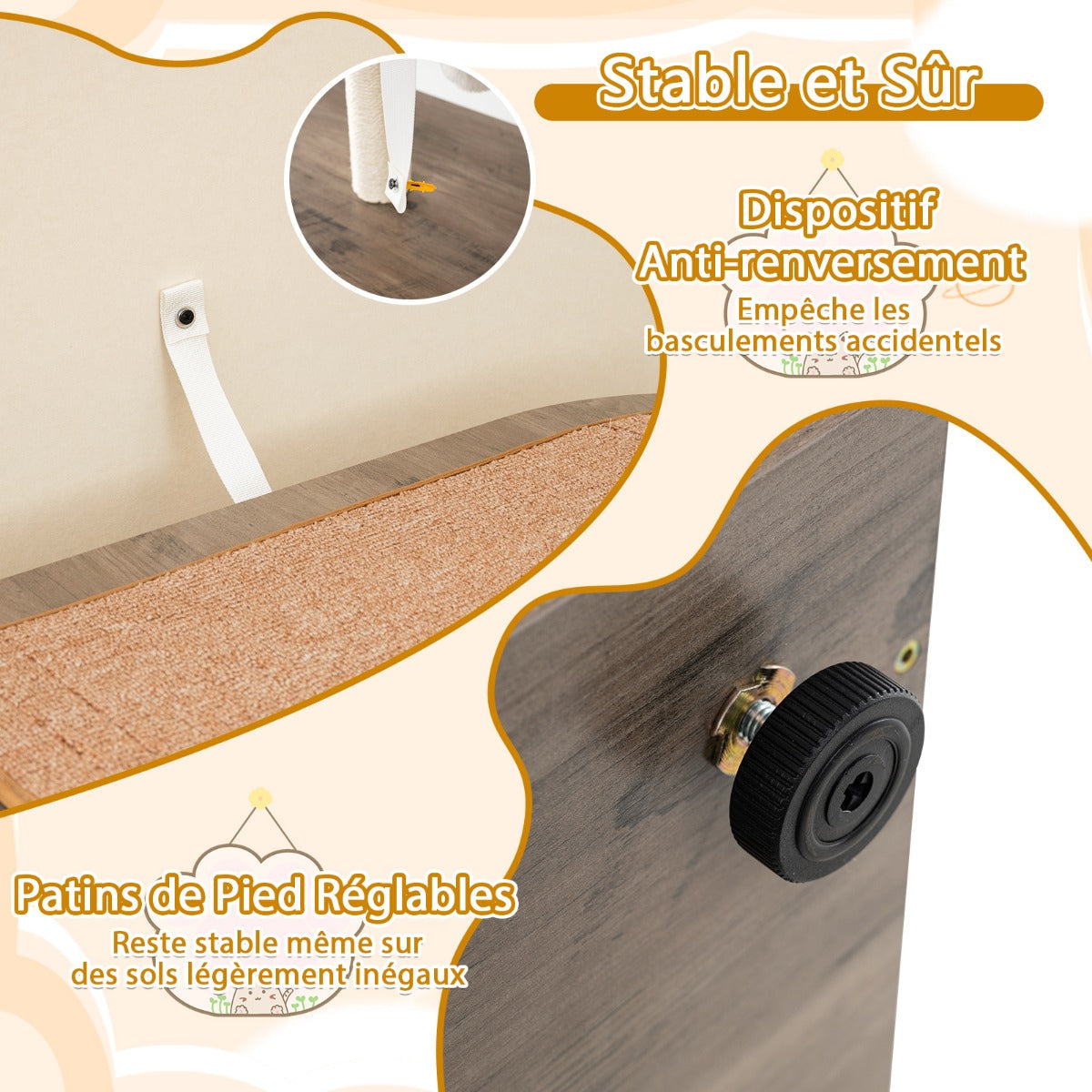Our multipurpose cat furniture seamlessly integrates a small cat tree and discreet litter box enclosure into a sleek design. The bottom cabinet serves not only as a hidden cat washroom for privacy and odor control, you can also add a cat bed for private resting, or store food and pet supplies, keep your space well organized. Moreover, the cat tower comes with a sisal scratching post and mat for cats to grind claws, complete with a plush ball with a bell adds extra fun, keeping your furry friends entertained and engaged. The large top perch with a soft mat provides a spacious and comfortable resting area for lounging and overlooking. For enhanced stability and security, our cat cabinet is equipped with an anti-toppling device and adjustable footpads, keeping both your pet and family safe from accidents. Our reliable cat tree with litter box enclosure is designed to create a happy and healthy space for your beloved pet! Bullet Point: 2-in-1 Cat Furniture: This wooden cat furniture measures 80 x 45 x 88cm(L x W x H), which combines a small cat tree and a cat litter box enclosure, saving floor space. The bottom multipurpose cabinet serves not only a hidden cat washroom but also a cat house or storage cabinet. Enhanced Privacy: This hidden litter box enclosure offers private space for kitten potty time, allowing cats to find a sense of security and belongings in the enclosed environment. It could also be a good solution to reduce unpleasant smells and reduce litter tracking. Add More Fun: The cat tower is equipped with a fully-wrapped sisal scratching post and a large sisal scratching mat, allowing cats to grind their claws. Furthermore, there is an interactive plush ball with a bell, offering your furry friends endless hours of enjoyment and exercise. Stable and Safe Construction: Adopting an anti-toppling device, the cat cabinet can be securely fixed on the tree, preventing accidental tip-overs when cats climb up and down. Furthermore, it is equipped with adjustable footpads, keeping stable even on slightly uneven floors. Comfy Resting Experience: Featuring a large top perch with a soft mat, the cat cabinet is also ideal for rest and relaxation. The mat is easy to detach, complete with waterproof veneered boards, making cleaning a breeze and ensuring a hygienic space for your cat to lounge. User-Friendly Details: The back panel comes with ventilated holes to keep the interior fresh, while the side cat hole with sealed edges prevents cat hair from sticking, maintaining a clean and tidy environment.Note: The maximum allowable size of litter box is 77 x 43 x 45 cm(L x W x H). Please measure the size of the cat litter box before purchase. Features: Combines a cat tree with a discreet litter box enclosure, versatile and functionalThe cabinet serves as a cat litter box enclosure, cat house, or a storage cabinetThe double-door cabinet offers privacy while hiding the mess and odor The scratching post and mat allow cats to grind claws and release instinctsThe scratching surfaces are made of natural sisal, resistant to scratch and wearThe interactive plush ball with a bell provides physical and mental stimulationComes with a spacious top perch for cats to lounge and observe their surroundingsThe top perch comes with a cozy mat, which is detachable for easy cleaningEquipped with an anti-toppling device, keep the cabinet stand still, prevent wobblingEquipped with adjustable footpads, ensure stability on various surfacesThe back panel features ventilation holes to ensure air circulationThe cat hole features sealed edges is not easy to stick to cat hairsThe cabinet adopts magnetic catches, keep the doors securely closed Specifications: Color: Gray+WhiteMaterial: Engineered Board, MDF, SisalProduct Dimensions: 80 x 45 x 88cm(L x W x H)Maximum Allowable Size of Litter Box: 77 x 43 x 45 cm(L x W x H)Size of the Top Perch Mat: 62 x 37 cm(L x W)Weight Capacity of the Top Perch: 20 kgWeight Capacity of the Middle Layer: 20 kgWeight Capacity of the Bottom Cabinet: 40 kgNet Weight: 17 kg Box qty: 1 Package Includes: 1 x Cat Tree with Litter Box Enclosure 1 x User’s Manual