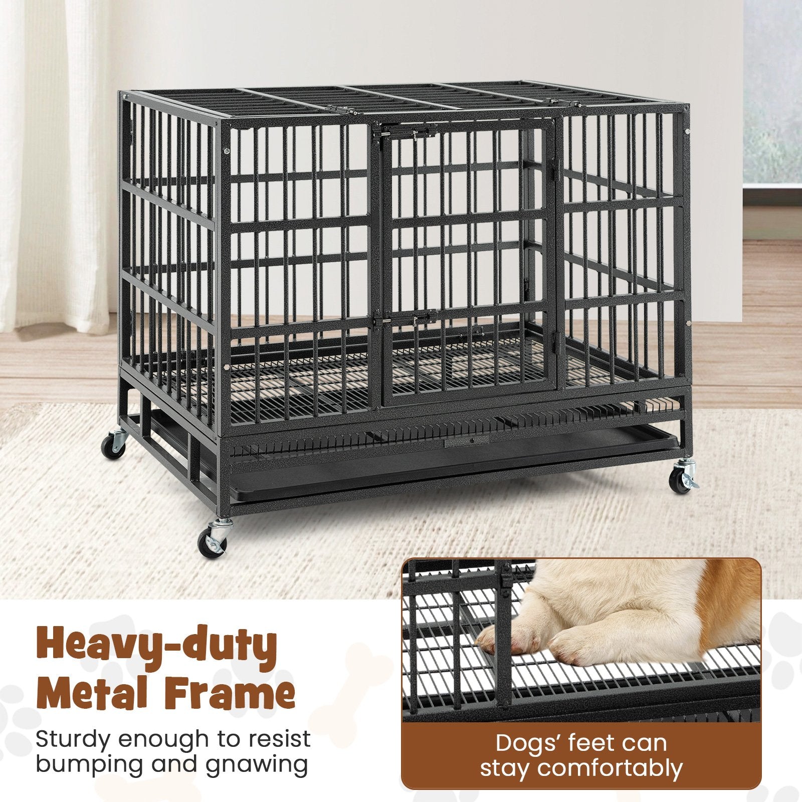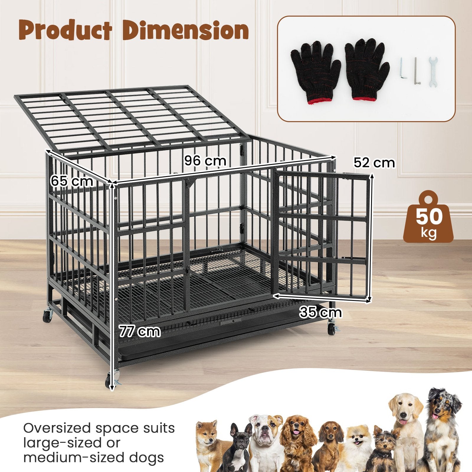 This large dog crate features a double-door design for easy access and interaction, complemented by 4 sturdy locks to prevent escapes. The dog kennel includes a removable tray that is easy to clean and supported by a metal flap to prevent accidentally slipping out. Moreover, made of premium deform-resistant metal, the indestructible kennel is a secure choice for your pet. Importantly, the dog cage is designed with 4 universal wheels for mobility and 2 lockable wheels to keep it in place when needed. You can fold the dog kennel for easy storage as needed, or quickly install it to use. If you are looking for such a product, do not hesitate to buy it! Heavy-duty Metal Frame: Made of heavy-duty metal, this dog cage measuring 96 x 65 x 77 cm / 120 x 76 x 90 cm (L x W x H) is tailored for medium-sized or small-sized dogs, especially those with high anxiety. The structure is sturdy enough to resist bumping and gnawing. Safe Double Door Design: Maximize accessibility and comfort with the double door design. The top door is for interacting with your dog, while the front door is easy for your dog to get in and out. Plus, each door features 2 robust locks to effectively stop your dog from escaping. Removable Plastic Tray: The bottom plastic tray for collecting spills can be removed, so the mess in the tray can be rinsed cleanly, ensuring a clean and comfortable environment for your pet. In addition, there is a metal flap to secure the tray in place, preventing it from falling out. Easy Mobility and 2 Brakes: Equipped with 4 universal wheels, 2 of which with brakes to keep the dog cage stable, this metal dog kennel not only features smooth mobility but also allows it to be securely stationed wherever needed without worrying about unintended movements. Foldable Design and Hassle-free Assembly: This escape-proof dog crate can be folded for easy storage and transportation. Therefore, it is quick and hassle-free to set the dog cage up or fold it up, saving you time and energy. Note: please measure the body length and body height of your lovely pet before purchase.