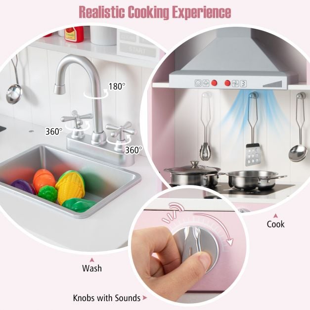 With premium materials and exquisite workmanship, this pretend play kitchen is built to last. Moreover, the adjustable height adapts to kids’ rapid growth. The range hood with real sounds and lights, as well as the rotatable faucet and switches, removable sink, microwave, oven and washing machine, creates much fun for little ones. In addition, the children’s play kitchen includes abundant accessories that permit toddlers to have different experiences. After playing, all items can be stored orderly thanks to the multiple storage areas, which helps cultivate children’s good habits from a young age. If you are looking for such a product, do not hesitate to buy it! 3-Level Available Heights: This pretend play kitchen offers 3-level height options that allow you to choose the desired height based on different needs. With detachable and raised foot covers, you can adjust heights easily. Immersive Cooking Experience: With this toy kitchen, kids can wash, cut and cook to enjoy a realistic cooking experience. Besides, the range hood with lights and sounds as well as the knobs with sounds adds fun. While the microwave, oven and washing machine bring different fun for toddlers. Sweet Accessories Included: The pretend play kitchen comes with stainless steel cooking accessories for long-lasting use. They are 3 utensils, 1 pot with lid, and 1 skillet. As a result, children will have hours of fun. Reliable Design and Rich Storage: Crafted from high-quality materials, the kids' kitchen promises to accompany kids to grow up. And the anti-toppling device is equipped for stability and safety. What’s more, the sufficient storage space holds a variety of items within reach. Perfect Gift for Children: The kids play kitchen set is suitable for kids over 3 years old, which is conducive to hands-on ability, imagination and creativity, parent-child interaction and social skills. Thus, toddlers will grow up happily and healthily.