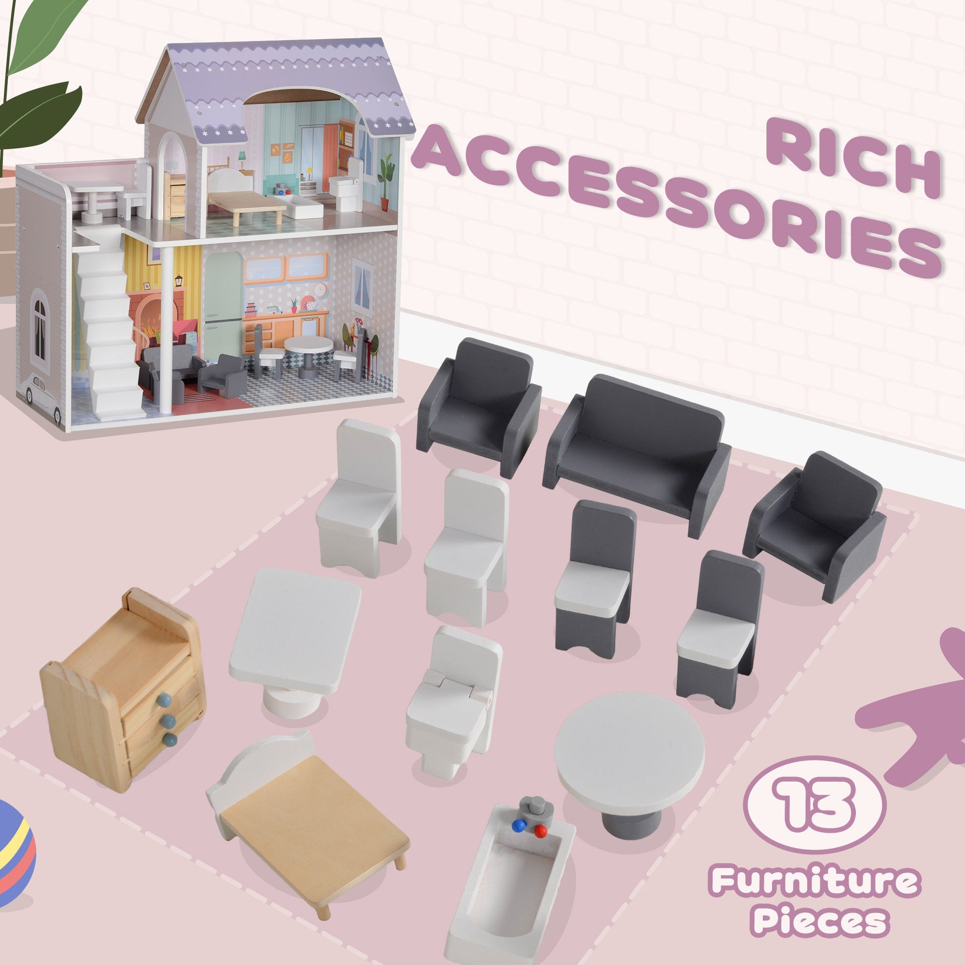 AIYAPLAY 2 Levels Dolls House with 13 Furniture Pieces, Play Set with Balcony, for Ages 3-6 Years, Multicoloured