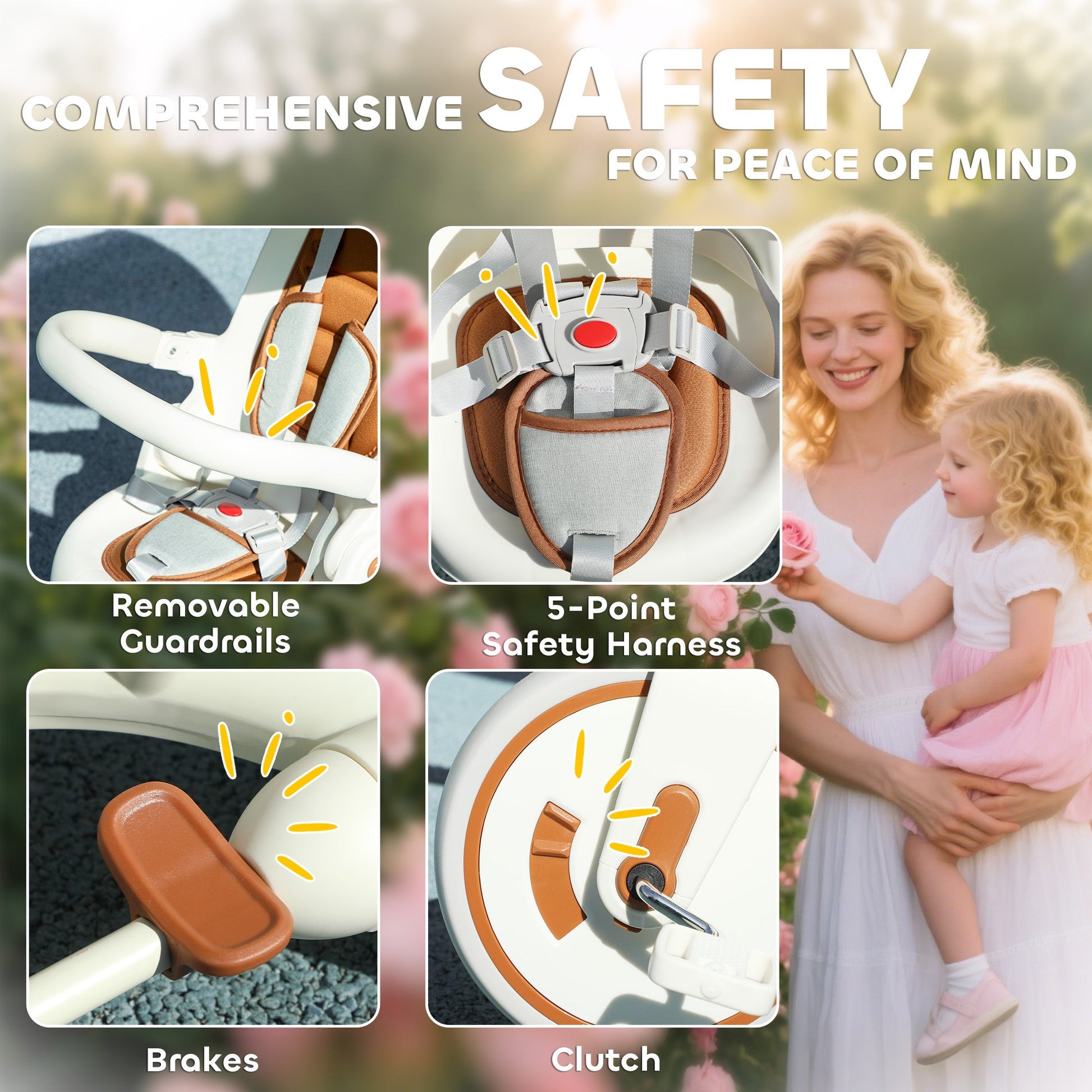Navigating family outings with ease, the AIYAPLAY baby trike transforms effortlessly between parent-steering, guided trike tricycle modes and bike modes. Safety is paramount with a five-point harness and removable safety bar, giving your little adventurer peace of mind. The adjustable push handle on this kids trike offers comfort for parents while fostering independence in children. Embrace joyful journeys with this versatile tricycle, designed for seamless transitions and secure travels.