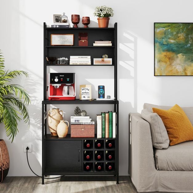 Bakers Rack with Power Outlet and Heavy-Duty Metal Frame-Black
