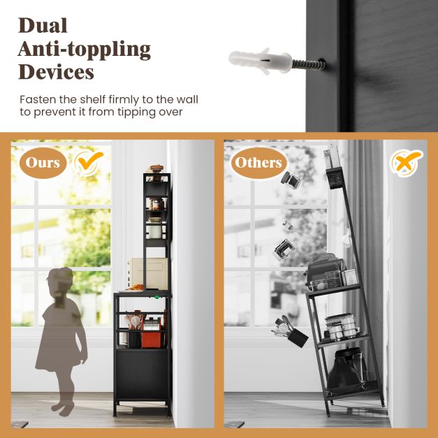 With various storage options, such as open shelves, a cabinet, hanging hooks, and wine bottle holders, this microwave stand offers a comprehensive organization solution for your kitchen items. Additionally, this coffee bar cabinet is equipped with UKCAcertified power outlet, featuring 2 AC outlets and 2 USB ports for charging devices and using electric appliances.The anti-rust metal frame provides stability, while adjustable foot pads ensure that the cabinet remains steady on uneven surfaces. To further secure the kitchen bakers rack, there are 2 anti-toppling devices that can be attached to the wall. Guardrails on each shelf also help to keep belongings in place.Overall, this versatile bakers rack effortlessly combines functionality and style, making it a perfect addition to your kitchen, dining room, or living room. Bullet Points: Built-in Power Outlet:Boasting a UKCAcertified power outlet, this kitchen bakers rack includes 2 AC outlets(250V/13A) and 2 USB ports(5V/2.1A), allowing you to conveniently charge devices and use electric appliances. The140 cmpower cordadds to the convenience of charging. AmpleStorage Space:The microwave stand offers multiple open shelves and a cabinet with door, providing ample room for cookware, tableware, and other items. Moreover, the hanging hooksand wine bottle holders offer specific storage solution for a comprehensive organization. Designed for Stability:Supported by a sturdy and rustproof metal frame, this coffee bar cabinet boasts long-lasting durability and sturdiness. Additionally, the adjustable foot pads can adapt to uneven surfaces, making the kitchen storage rack more stable during use. Secure Construction:The coffee bar station comes with 2 anti-toppling devices that fasten the shelf firmly to the wall to prevent it from tipping over. With anti-falling guardrails on each shelf, your belongings will remain securely in place for your peace of mind. Multipurpose Design:Whether you need a coffee bar, wine storage, or a microwave stand, this versatile bakers rack fits seamlessly into your home. The elegant appearance coordinates well with other furniture, enhancing both functionality and style in your space.