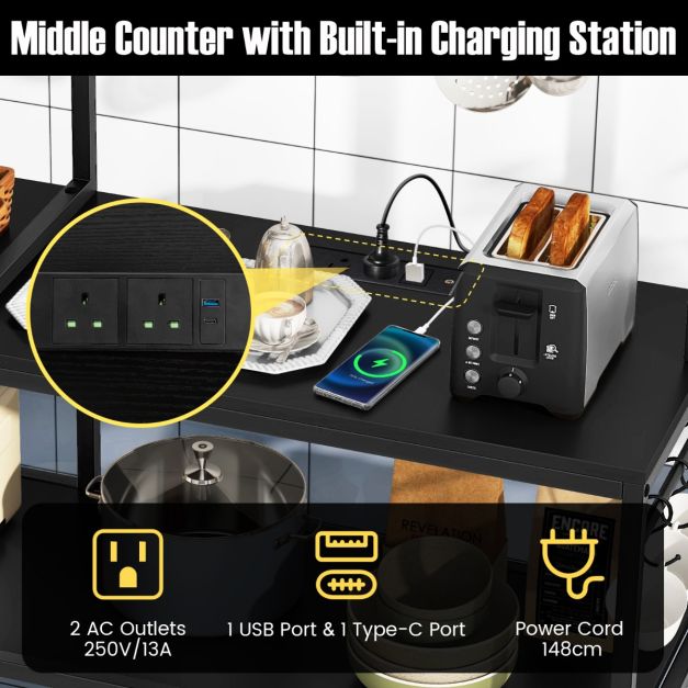Experience enhanced efficiency with our 5-tier kitchen baker's rack, meticulously designed to maximize your kitchen storage. The generously spaced open shelves facilitate effortless organization, while the expansive counter, equipped with a built-in charging station, perfectly satisfies contemporary culinary demands. The inclusion of 10 S-shaped hooks significantly boosts its versatility. Adjustable foot pads and anti-toppling devices ensure safe and stable use. Extending its utility beyond the kitchen, this elegantly simple rack easily doubles as a coffee or wine bar, or even a printer stand, blending style and function seamlessly. Maximized Storage Solutions:Enjoy a more organized kitchen with our 5-tier bakers rack.Itsopen shelves are designed to accommodate everything from small cans to larger groceries, keeping themneatly organized and easily accessible. Charging Made Easy:The spacious middle counter comes equipped with 2 built-in AC outlets foryour kitchen appliances, along with a USB port and a type-C port for your tablets and smart phones. Check the recipe whenever needed. SafetyandStability:Safety prevails with our kitchen rack, featuring 6 adjustable foot pads for a balanced layout. Foryourpeace of mind, 2 anti-toppling devices are included, prevent any tipping accidentsfor homes with pets or young kids. Versatile Additions: Thisutility rack also features 10 S-shaped hooks, adaptable for both the top and side bars. It seamlessly converts into a coffee bar, bar cabinet, or printer stand, enhancing anydining or working space. Durability andEase:Crafted with a sturdy frame and thick shelves, our robustkitchen utility rack promises long-lasting use. Cleaning is a breeze too—simply wipe down with a wet cloth to maintain its pristine appearance.