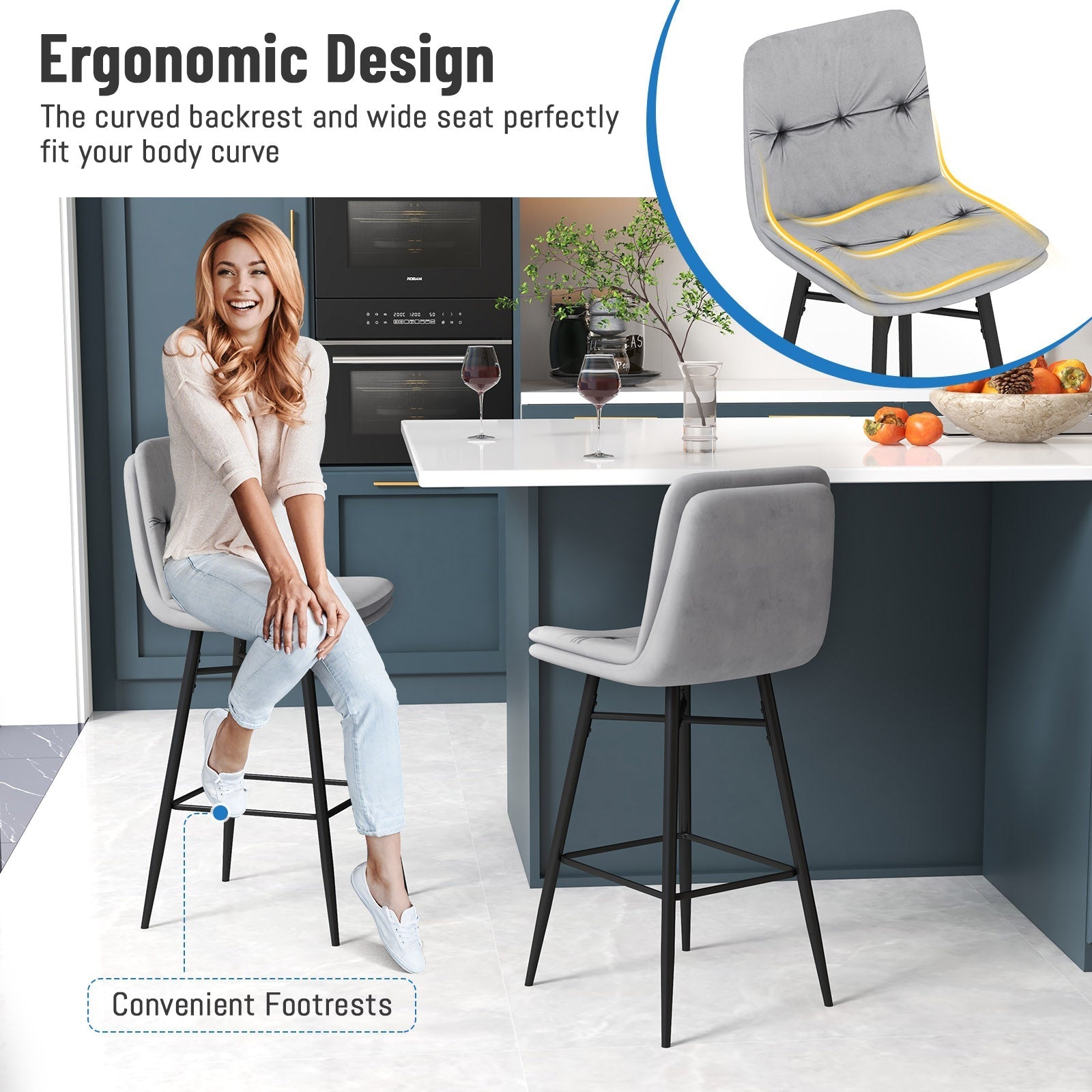 Bar Stools Set of 2 with Tufted Back, Metal Footrests and Legs-Grey