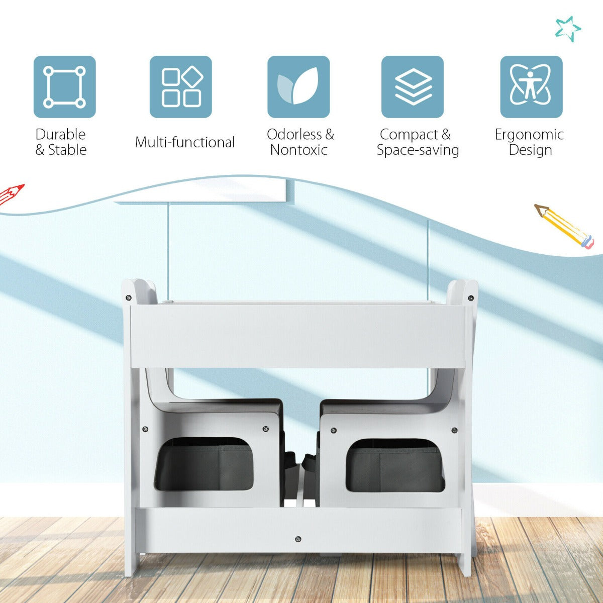 The double-sided tabletop offers a chalkboard side, allowing children to draw or colour on it and a white/grey side, suitable for playing on. Under the tabletop, there is a small space suitable for storing pens, chalks and paper etc. Each chair has a specially designed fabric drawer, suitable for storing toys, books etc., encouraging children to tidy up after play. If you are looking for a child's table and chair set like this, do not hesitate to place an order! ‚óè 2-In-1 Desktop: The double-sided tabletop offers children ample space to play on. The chalkboard side allows children to write and draw with coloured chalks whilst the white/grey side provides ample space to play games, eat or draw on. ‚óè Superior Children Friendly Material: Made from high-quality MDF, and coated with non-toxic paint, the activity table set has been designed to be used by children and is child safe. ‚óè 2 Storage Boxes and Hidden Under Tabletop Storage: This children's table and chair set have been designed with storage space, encouraging children to clean up after themselves. Under the tabletop, there is space for small toys, books or building blocks whilst the chairs are both supplied with fabric boxes. ‚óè Appropriate Dimension for Children:: Designed for use by children, the chairs have ergonomic backrests, and the table has a central footrest for children to rest their feet on offering comfort whilst playing. ‚óè Perfect Gift for Children Aged 3-7 years: This children table set is an ideal present for children. With 2 chairs, your child has space for a friend or parent to play too.