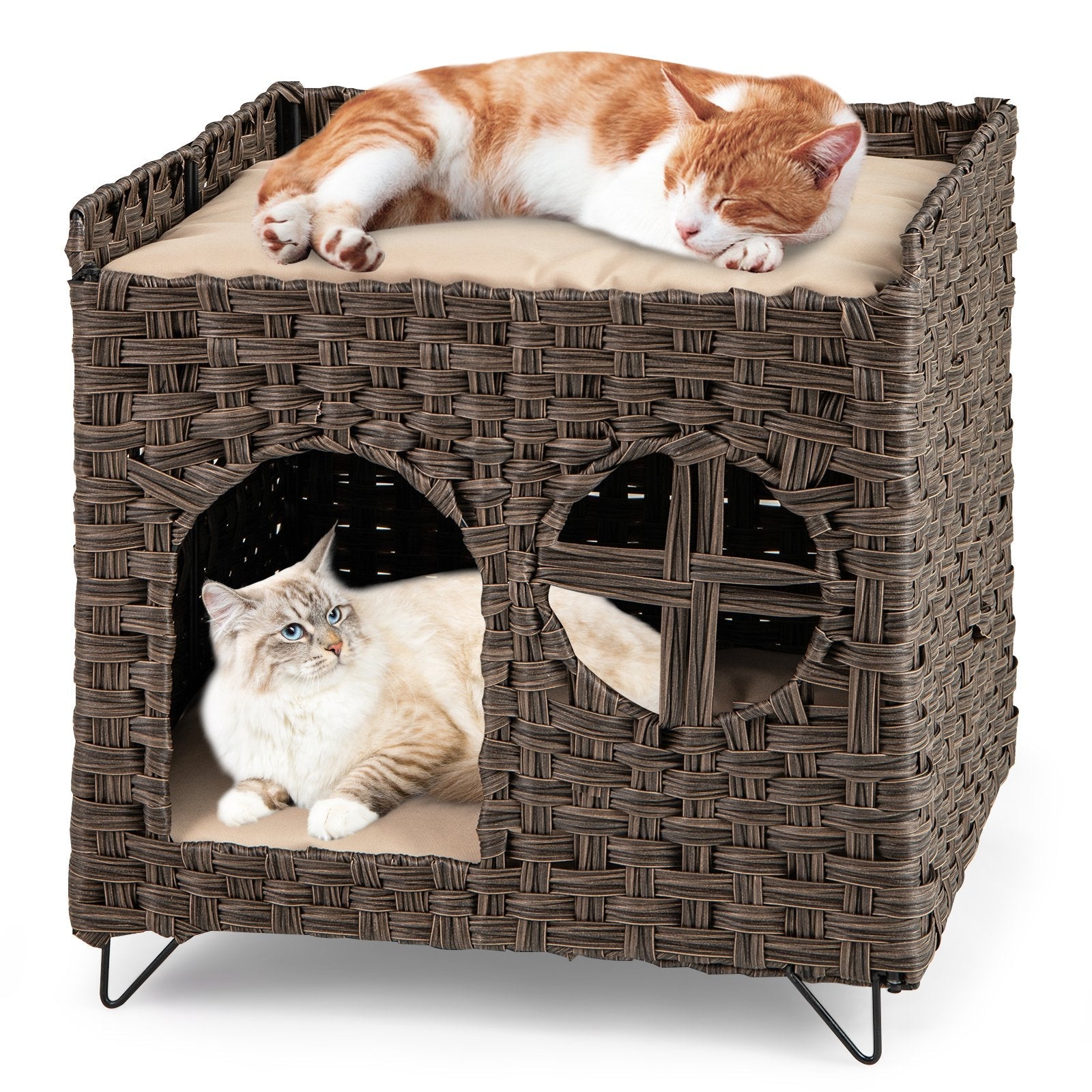 Upgrade your cat's living space with this elegant rattan cat house. Thanks to a folding structure, the wicker pet condo can be quickly set up. The sturdy rattan material ensures durability, making it a long-lasting investment in your cat's comfort. Cats will love lounging in the spacious condo, which is equipped with a padded cushion. Additionally, the arched doorway offers a sense of adventure and playfulness for kittens. Also, the large perch with raised edges provides a panoramic view of their surroundings. The removable cushions are washable, making cleaning a breeze. Furthermore, the elevated legs keep cats off the floor, while promoting airflow. Deluxe 2-tier Design: The lower tier of the cat condo serves as a secure retreat, which features an entrance and a retro window to ensure easy access and excellent airflow. Additionally, the top perch allow kittens to lounge and observe surroundings, thus meeting their curiosity. Suitable for All Season: With breathable PE rattan construction, the pet house will create a cooler lounging experience during hot days. Moreover, the 2 sponge filled cushions allow your cats to lounge in warmth and comfort. Also, the cushion can be removed for extra cool. Simple Assembly: The smart, collapsible design allows for the rattan cat bed to be stored away or transported effortlessly. This user-friendly feature ensures that you can assemble or disassemble the cat bed quickly without tools. Wide Application: Not limited to just a sleeping haven for cats, the wicker cat house can be used as a side table or nightstand in your living room, bedroom, or entryway. The top tier can hold decorative items or essential belongings. Easy Maintenance: The cushions are washable, making it a breeze to keep your pet's sanctuary clean. Additionally, the selected PE rattan is waterproof, allowing you to maintain the 2-tier nest in pristine appearance with minimal effort.