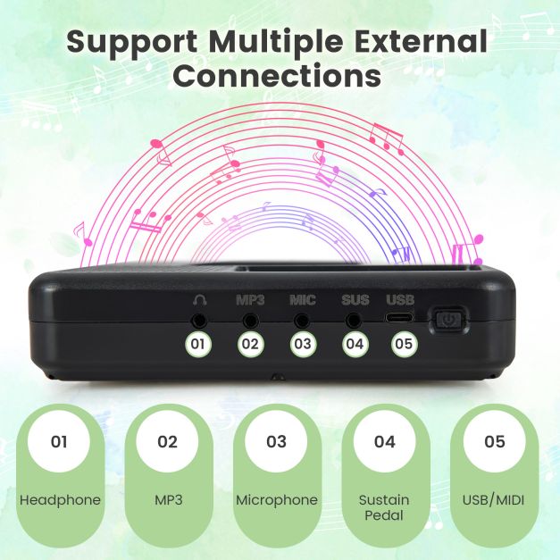 Unleash your musical talent with this foldable 88-key electronic keyboard! The digital piano features 88 full size touch-sensitive keys, which allow you to change the sound depending on how hard you press the keys. With the added convenience of Bluetooth APP connectivity and MIDI support, you can easily connect your keyboard to your smartphone, tablet and piano apps. Besides, the digital keyboard includes 128 tones, 128 rhythms and 20 demos to help you learn different kinds of songs and chords. With its built-in 1750mAh lithium battery, you can enjoy up to 10-12 hours of continuous playtime on a single charge. What's more, the foldable design and included carry bag allow you to take your music anywhere you go with ease. Folding 88 Keys Digital Piano: This electric piano keyboard can be folded in half and only weighs 3.2 kg. A carrying bag is included for you to take it anywhere. Besides, designed with 88 sensitive full-size keys, the digital piano can give you a piano-like finger touch and accurate sound. Powerful Music Function: This digital piano comes with a clear digital display and multiple function buttons, including dual keyboards, volume adjustment, chord, metronome, sustain, okon (teaching mode), etc. Plus, it also has 128 tones, 128 rhythms and 15 demos, which is ideal for beginners. Bluetooth Connection and MIDI Function: Thanks to the Bluetooth function and MIDI interface, you can connect the electric piano keyboard to your iPad or phone to take a lesson or have music editing. It is applicable for several piano apps, like GarageBand, Perfect Piano, Pop Piano, etc. Multiple External Connections: This foldable piano is equipped with multiple interfaces to support multiple external connections: headphone, MP3, microphone, sustain pedal and USB/MIDI. Moreover, dual external speakers will create a more stereo surround sound.Long-hour Playing Available: Equipped with a rechargeable 1750mAh lithium battery, the electric piano keyboard can play up to 10-12 hours after full charge of 4 hours. What's more, the foldable piano comes with a power adaptor, a sustain pedal, a convenient holder and a user manual.