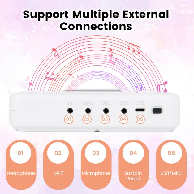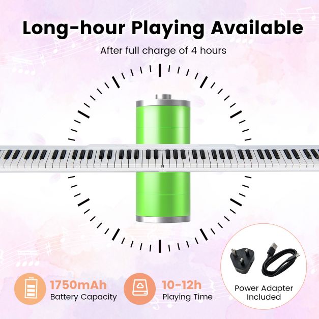 Unleash your musical talent with this foldable 88-key electronic keyboard! The digital piano features 88 full size touch-sensitive keys, which allow you to change the sound depending on how hard you press the keys. With the added convenience of Bluetooth APP connectivity and MIDI support, you can easily connect your keyboard to your smartphone, tablet and piano apps. Besides, the digital keyboard includes 128 tones, 128 rhythms and 20 demos to help you learn different kinds of songs and chords. With its built-in 1750mAh lithium battery, you can enjoy up to 10-12 hours of continuous playtime on a single charge. What's more, the foldable design and included carry bag allow you to take your music anywhere you go with ease. Folding 88 Keys Digital Piano: This electric piano keyboard can be folded in half and only weighs 3.2 kg. A carrying bag is included for you to take it anywhere. Besides, designed with 88 sensitive full-size keys, the digital piano can give you a piano-like finger touch and accurate sound. Powerful Music Function: This digital piano comes with a clear digital display and multiple function buttons, including dual keyboards, volume adjustment, chord, metronome, sustain, okon (teaching mode), etc. Plus, it also has 128 tones, 128 rhythms and 15 demos, which is ideal for beginners. Bluetooth Connection and MIDI Function: Thanks to the Bluetooth function and MIDI interface, you can connect the electric piano keyboard to your iPad or phone to take a lesson or have music editing. It is applicable for several piano apps, like GarageBand, Perfect Piano, Pop Piano, etc. Multiple External Connections: This foldable piano is equipped with multiple interfaces to support multiple external connections: headphone, MP3, microphone, sustain pedal and USB/MIDI. Moreover, dual external speakers will create a more stereo surround sound.Long-hour Playing Available: Equipped with a rechargeable 1750mAh lithium battery, the electric piano keyboard can play up to 10-12 hours after full charge of 4 hours. What's more, the foldable piano comes with a power adaptor, a sustain pedal, a convenient holder and a user manual.