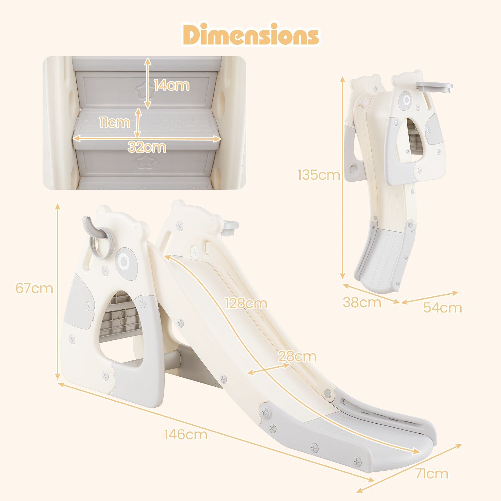Color: Gray Materials: HDPE, PP Dimensions of Unfolding: 146 √ó 71 √ó 67 cm (L x W x H) Dimensions of Folding: 54 √ó 38 √ó 135 cm (L x W x H) Size of Each Stair: 32 √ó 11 √ó 14 cm (L x W x H) Size of Slide: 128 √ó 28 cm (L x W) Diameter of Basketball Hoop: 18 cm Net Weight: 6 kg Weight Capacity: 70 kg Suitable Ages: 3+ Years Old Box QtyÔºö 1(May vary by batch) Package Includes: 1 √ó Freestanding Slide 1 √ó Basketball 1 √ó Inflator 3 √ó Rings 1 √ó Instruction