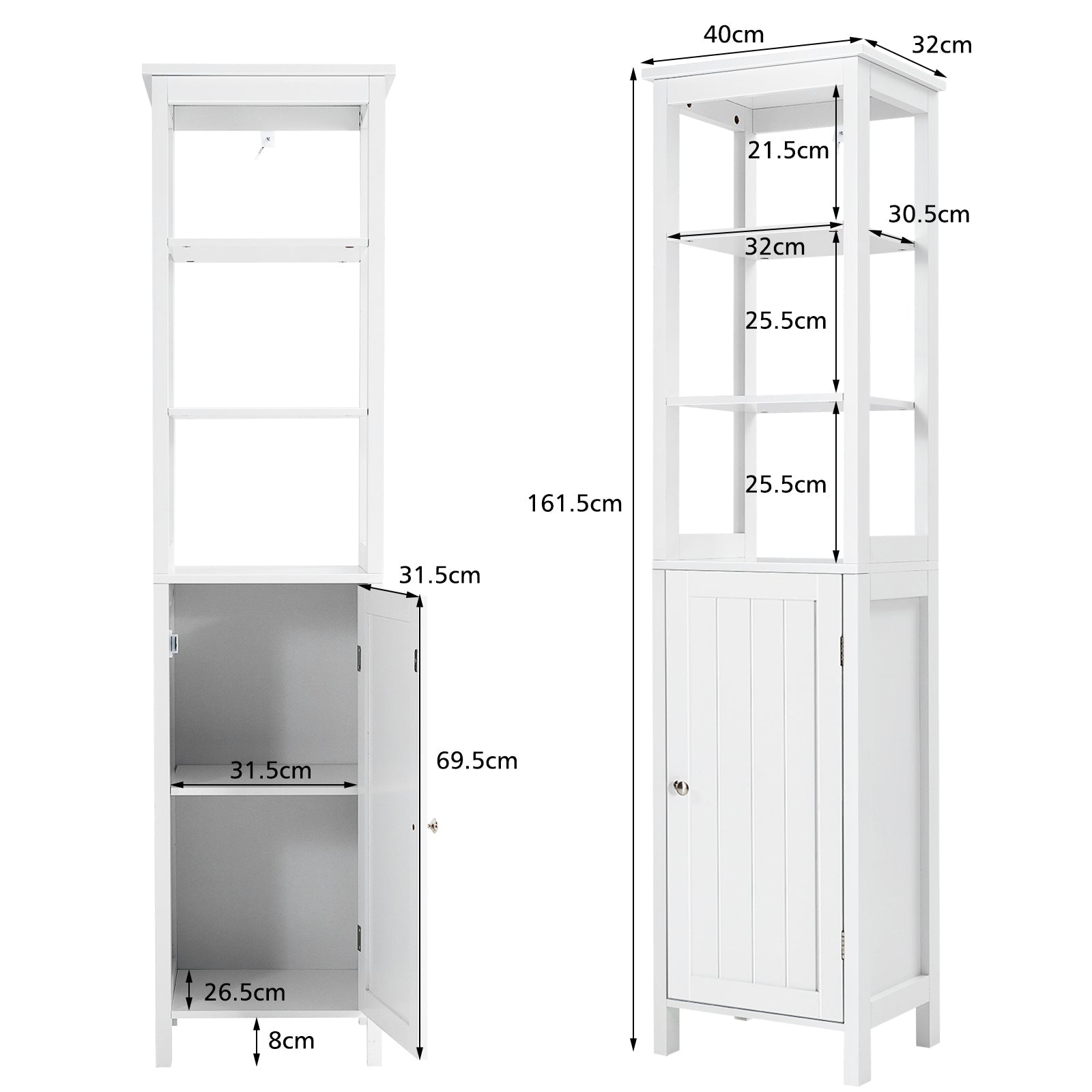 Colour: White Material: MDF Product Dimensions: 40cm x 32cm x 161.5cm (LxWxH) Load Capacity: 18 lbs (Each Tier); 10kg (Bottom Part) Net Weight: 17kg Box Qty:1(May vary by batch)Package includes: 1 x Freestanding Bathroom Cabinet 1 x Instruction Instruction