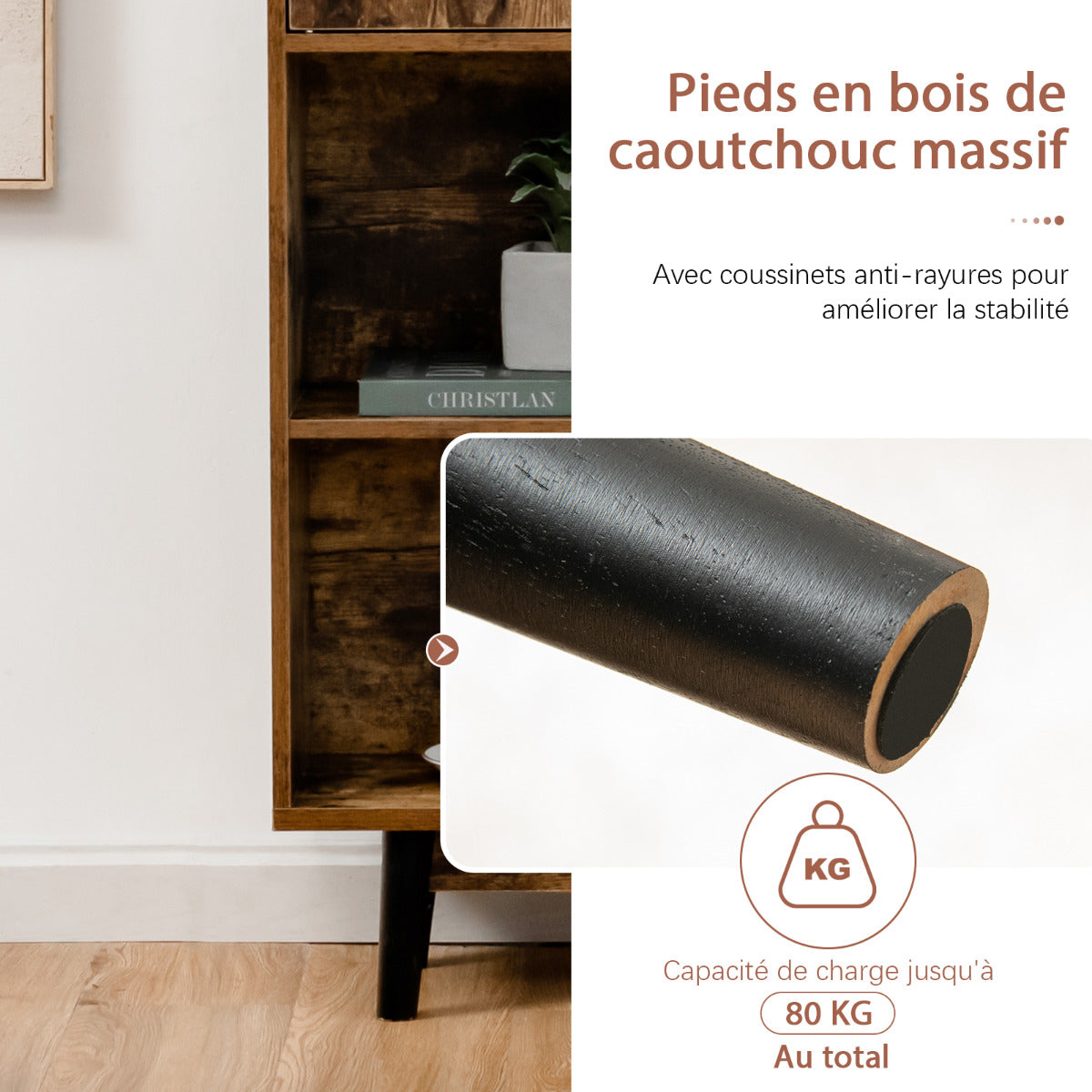 This 4-tier storage cabinet organizes your books, CDs, and other daily essentials with order and within reach. It provides concealed and open display storage options. And you will find it seamlessly blends into your living room, bedroom, and office with a suitable style. This storage cabinet expands its functionality by serving as a cupboard, a sideboard, a bookcase, and a room divider. And the rubber wood legs with foot pads stably support the cabinet. With the anti-tipping designs, this cabinet is safe around your kids or pets. Besides, it is easy to assemble with detailed instructions. If you are looking for such a product, don't hesitate to place an order! Endless Storage Options: This wooden storage cabinet features 2 storage doors for hiding the mess and 4 open shelves for displaying your book collection and decorations. Besides, the cabinet top allows you to place photos, plants, and other daily essential items. Bring into Good Style: Thestorage sideboard sets up doors and shelves in an irregular yet harmonious way to bring your interior unique furniture. This side cabinet will seamlessly blend into your living room, bedroom, dining room or study, and complement well with existing decorations. Stable and Safe Design: Resting on solid rubber wood legs with anti-scratch foot pads, this tall cupboard stands stable and balanced with a high loading bearing capacity. The anti-tipping devices firmly mount the bookshelf against walls to prevent accidental falling and add safety for the family. Multifunctional Furniture: In addition to collecting your daily essentials, this floor storage cupboard also serves as a bookcase, a kitchen buffet cabinet, a tall cupboard, a sideboard and more. Several of these storage cabinets can form a line of room dividers to upgrade and improve the room configuration. Easy to Assemble andMaintain: To help you assemble successfully, this accent cabinet bookcase comes with detailed instructions and clearly labelled parts. And the surface is smooth for easy maintenance. Besides, the robot clean can slide under the cabinet for daily cleaning.