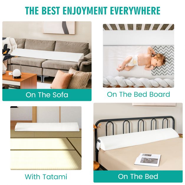 Color: White Material: 25D sponge, polyester Full size: Overall dimension: 137 x 25 x 14cm (L x W x H) Max gap length: 18cm Net weight: 1kg Queen size: Overall dimension: 152 x 25 x 14cm (L x W x H) Max gap length: 18cm Net weight: 1.5kg Package includes: 1 x Bed wedge pillow