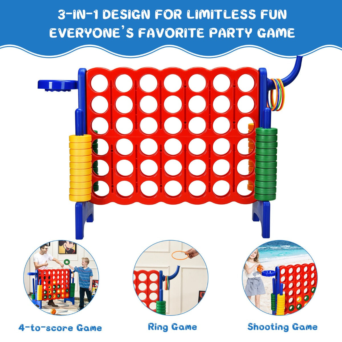 Compared to other traditional 4-to-score game sets, this 4-to-score giant game set comes with a more immersive experience. It keeps everyone entertained for hours, perfect for both adults and kids. Made of premium PP and PE material, it features a long lifespan and better toughness. For kids, high-quality material is safe and nontoxic for long-time use. Plus, it assists children in ability development. By aligning four pieces in a row and blocking the opponent's pieces, children effectively enhance cognitive ability, hand-eye cooperation, logical thinking and more. Additionally, it's of great ease to assemble the set within minutes without any tool. With a weight of 10lb, it's convenient to carry out for outdoor use. Surely, it fits in exactly with your wishes. If you are looking for a game set like this, do not hesitate to place an order! 3-in-1 Design for Endless Fun: A smart combination of connecting 4 games, basketball games and ring toss definitely offers more fun. Three different games serve to keep everyone entertained for long hours. With only one game set, everyone can be immersed in their favorite games and enjoy a completely different playing experience. (Basketball and rings are included.) Easy Assembly and Convenient to Carry: This jumbo four in a row game can easily be set up or taken apart to take to your next party. You can do all the assembly in just a few minutes without using any tool. In addition, made of high-quality plastic materials, the whole game set only weighs 5kg, lightweight to carry out for outdoor use. Fun for Everyone Everywhere: Just have a blast with this 4-to-Score game set at home, backyard, birthday or holiday parties, weddings, friend gatherings and more. It's perfect for users of all ages as well as indoor and outdoor use. Thanks to that, family game nights can be more exciting and enjoyable. Premium Materials and High Durability: The materials used in this giant 4-in-a-row game set are carefully selected, so there are no safety risks. Premium PE and PP materials are very durable and can provide you with long service life. And the edges are very smooth to ensure that the player will not be scratched during the game. Perfect Gift for Kids: This colorful giant game toy is the perfect gift for children. Whether it's a holiday or birthday, this 4-in-a-row game set is always a surprise and will keep them entertained for hours. The rules are very simple and children can learn them quickly. Besides, through this game, children's motor skills, hand-eye coordination and cognitive skills can be greatly improved.