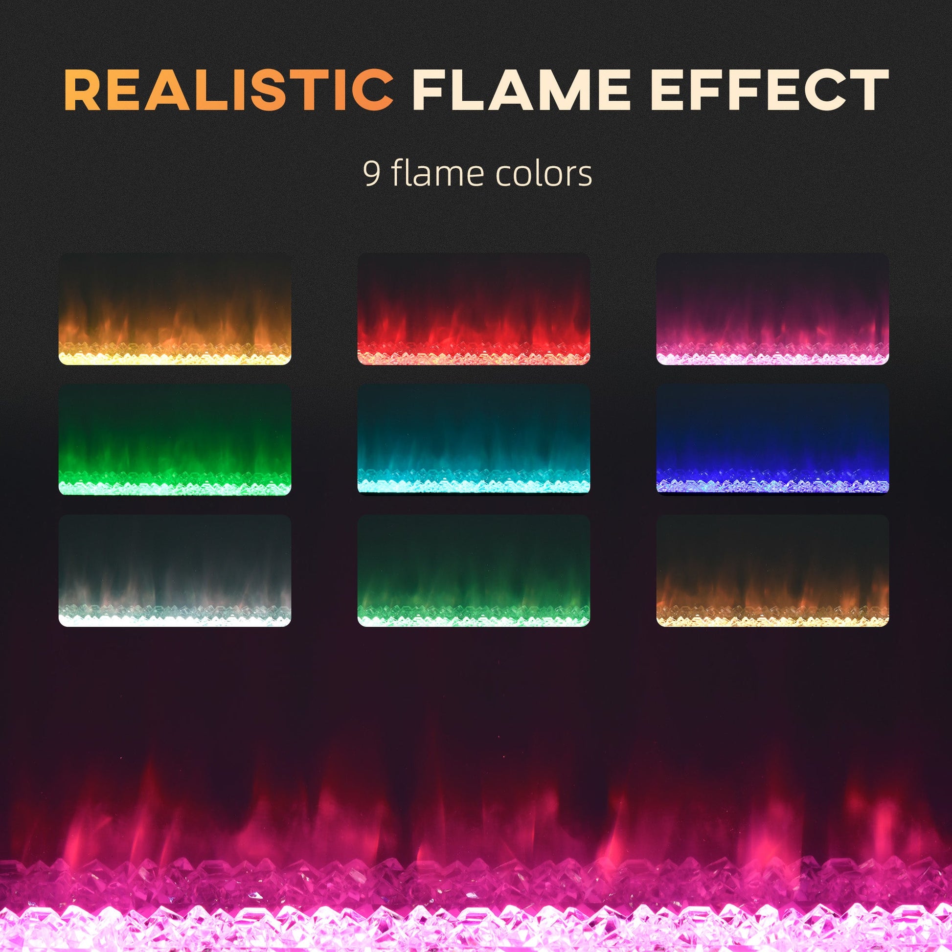 - Nine flame colour, heat and running time are adjustable