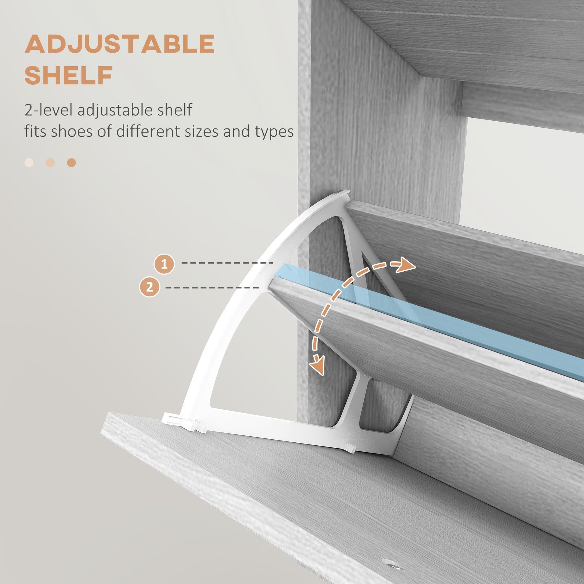 - Two-level adjustable shelf in the each flip drawer: adjust the size easily