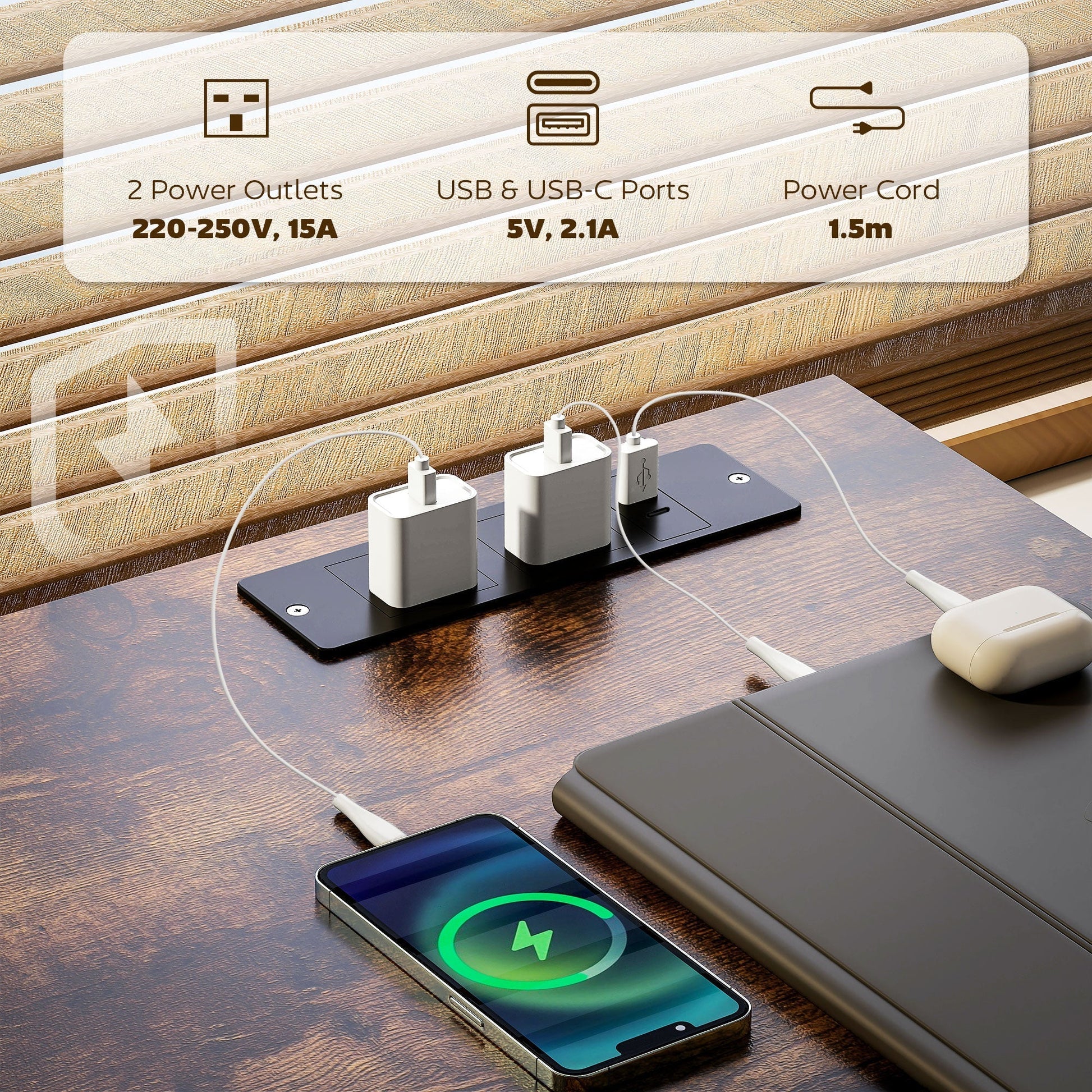 - Built-in charging station with various ports keeps devices powered
