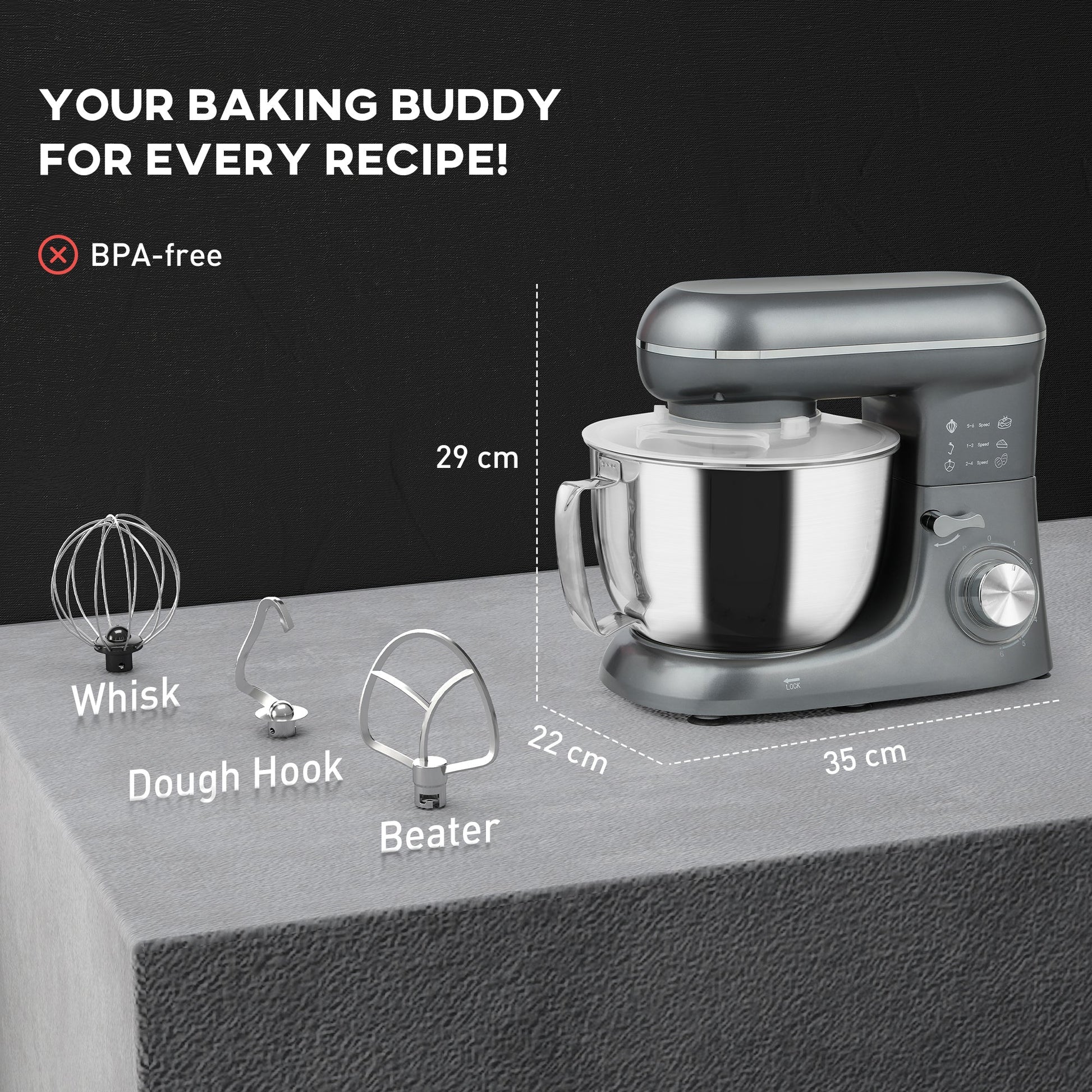 - 4.5L stainless steel bowl holds lots of ingredients at once. Create plenty