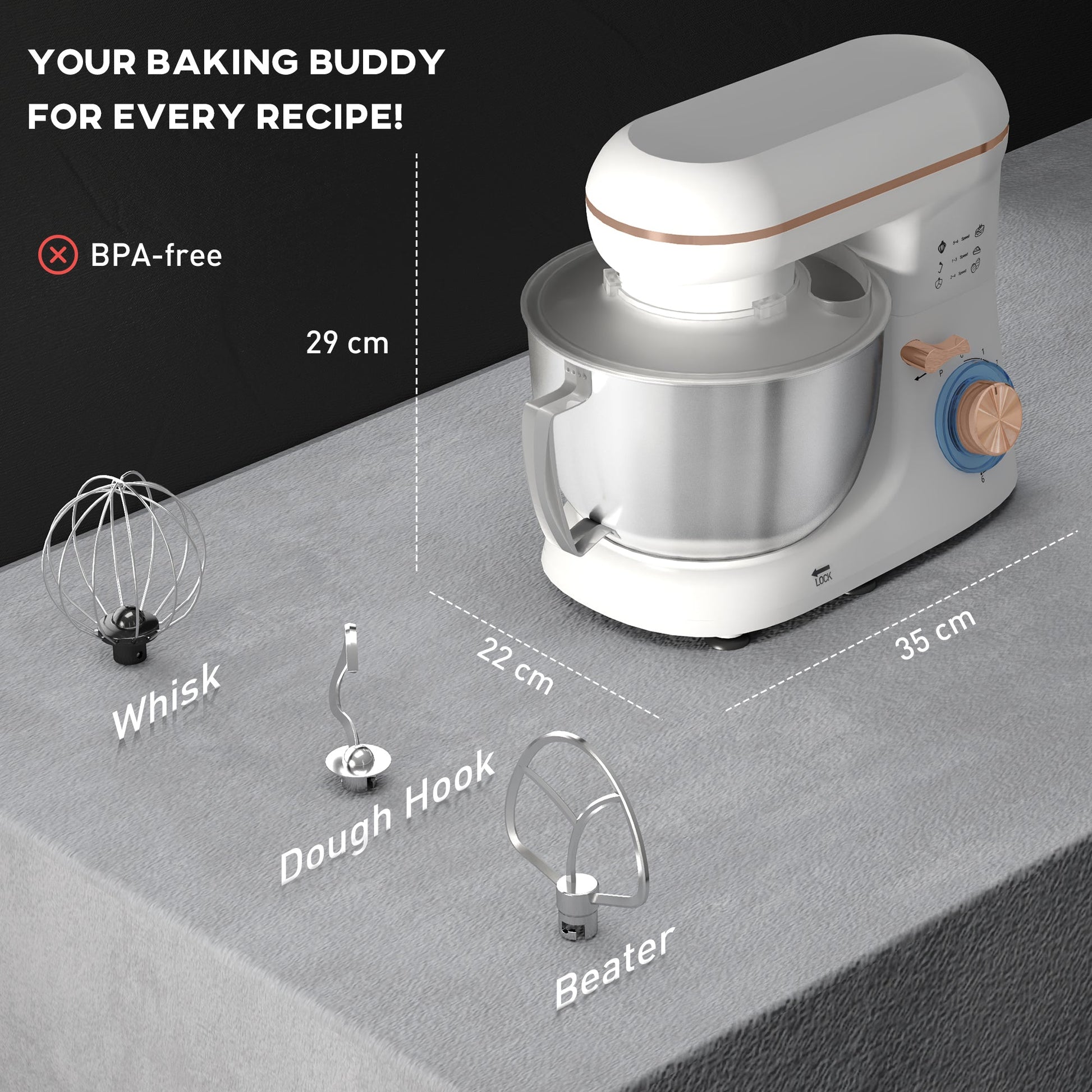 - 4.5L stainless steel bowl holds lots of ingredients at once. Create plenty
