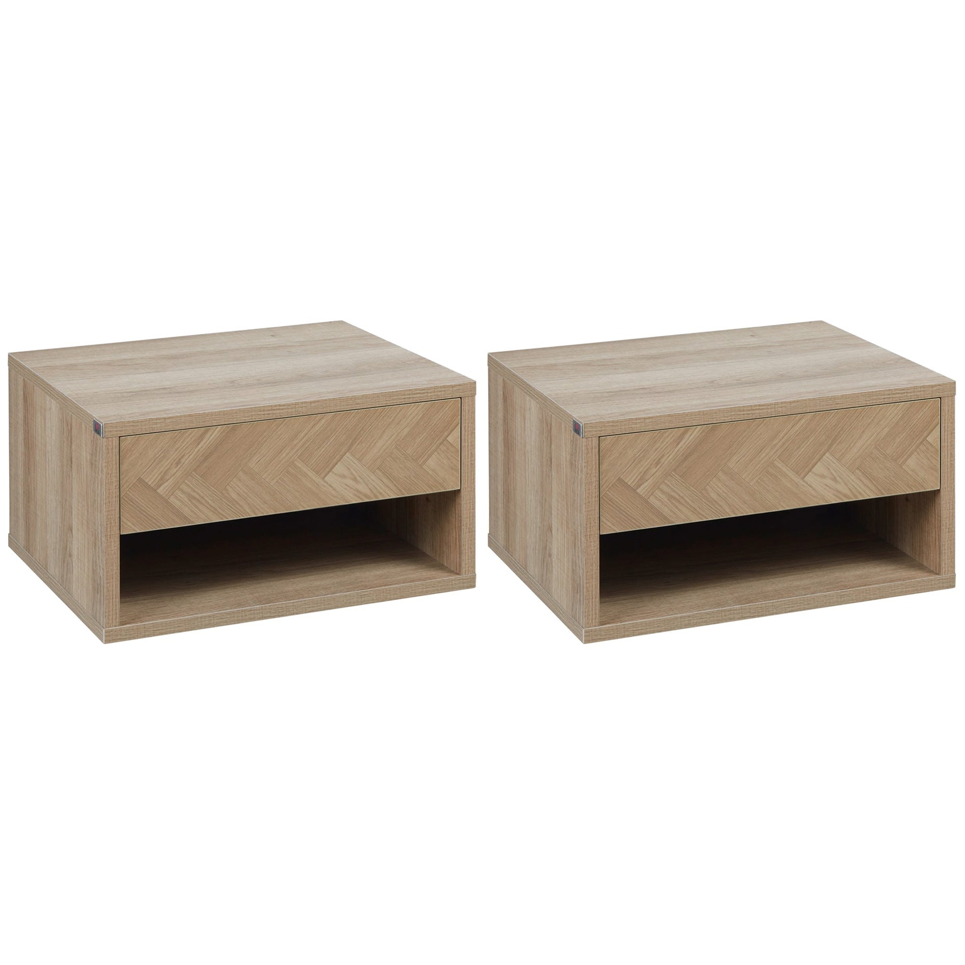HOMCOM 2 Pieces Bedside Table Wall Mounted Nightstand with Drawer and Shelf for Bedroom, 37 x 32 x 21cm, Natural
