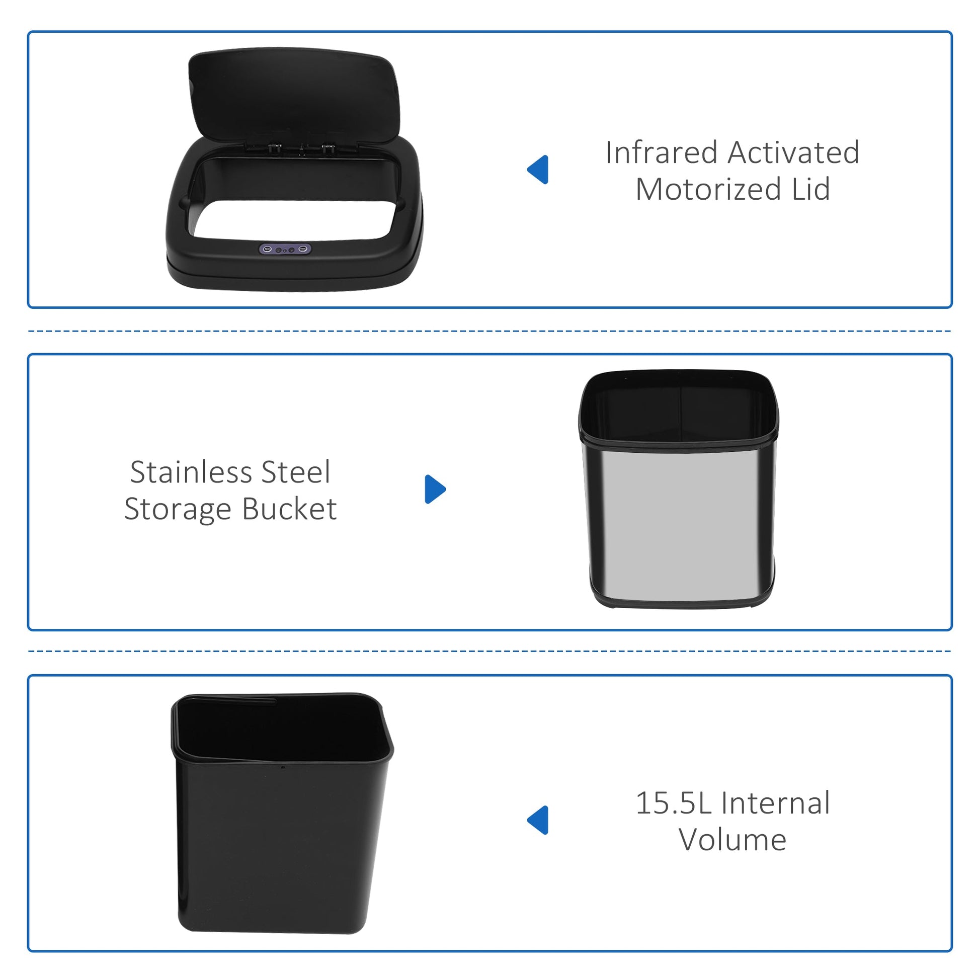 Differing from past traditional foot operated bins, this series of sensor dustbins use infrared technology for convenient use. It will sense your approaching, activating the motorised lid for your convenience. The lid will automatically close after a few seconds of non-usage. The units can also be opened and closed manually by pressing the buttons on the lid. These bins are battery powered so no wiring is needed. Just pop in 4 AA batteries and the bin is ready to use.
