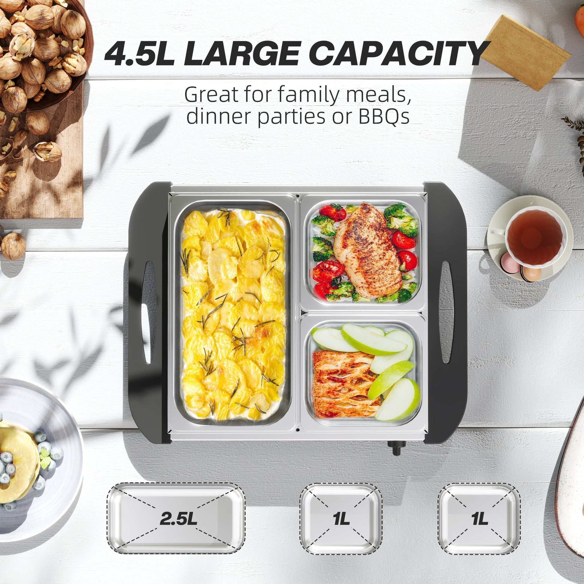- 4.5L capacity: food warmer buffet server comes with a 2.5L large tray and two 1L smaller trays. Lids included