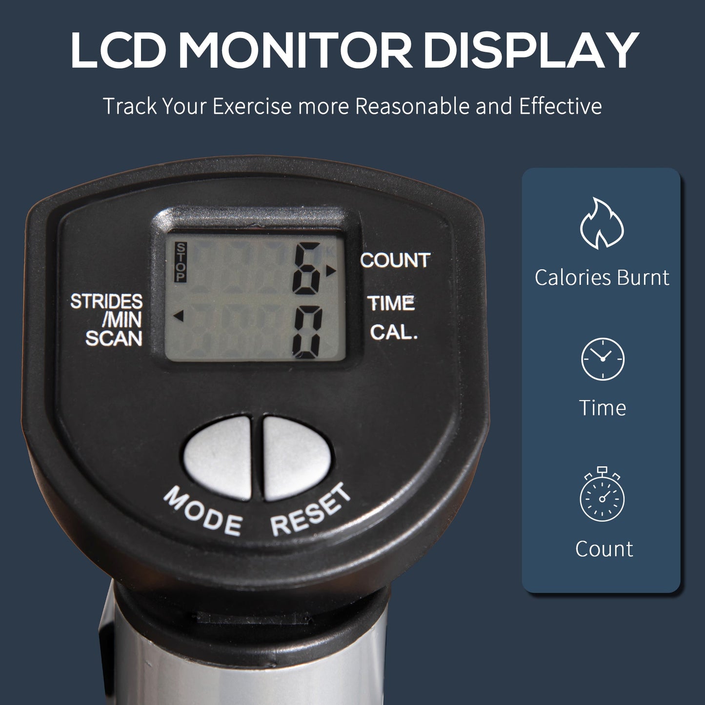 Tone your glutes and thighs with this HOMCOM fitness stepper. Build with an adjustable handlebar can offer you a full body workout, the stepping pedals works your calves, buttocks, thighs and hips. The stepper includes non-slip foot pedals, and foam handlebars for extra stability and comfort, LCD monitor screen to help keep track of time, calories burned and number of steps. Enjoy a fun and easy fitness workout at home or office!