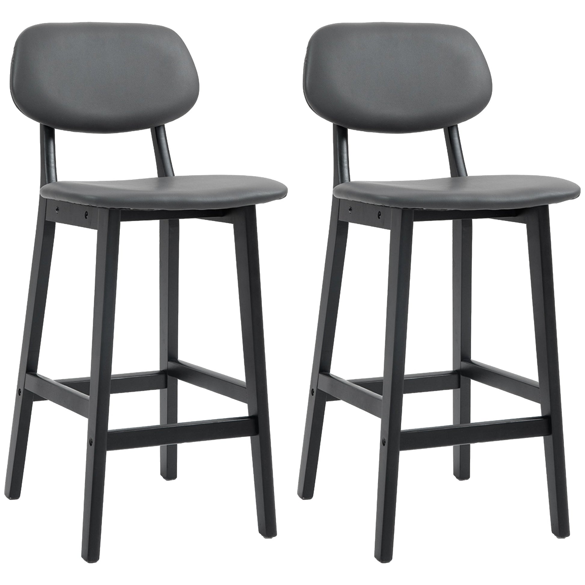 HOMCOM Bar Stools Set of 2, Breakfast Bar Chairs, PU Leather Upholstered Kitchen Stools with Backs, Footrests and Solid Wood Legs, Dark Grey