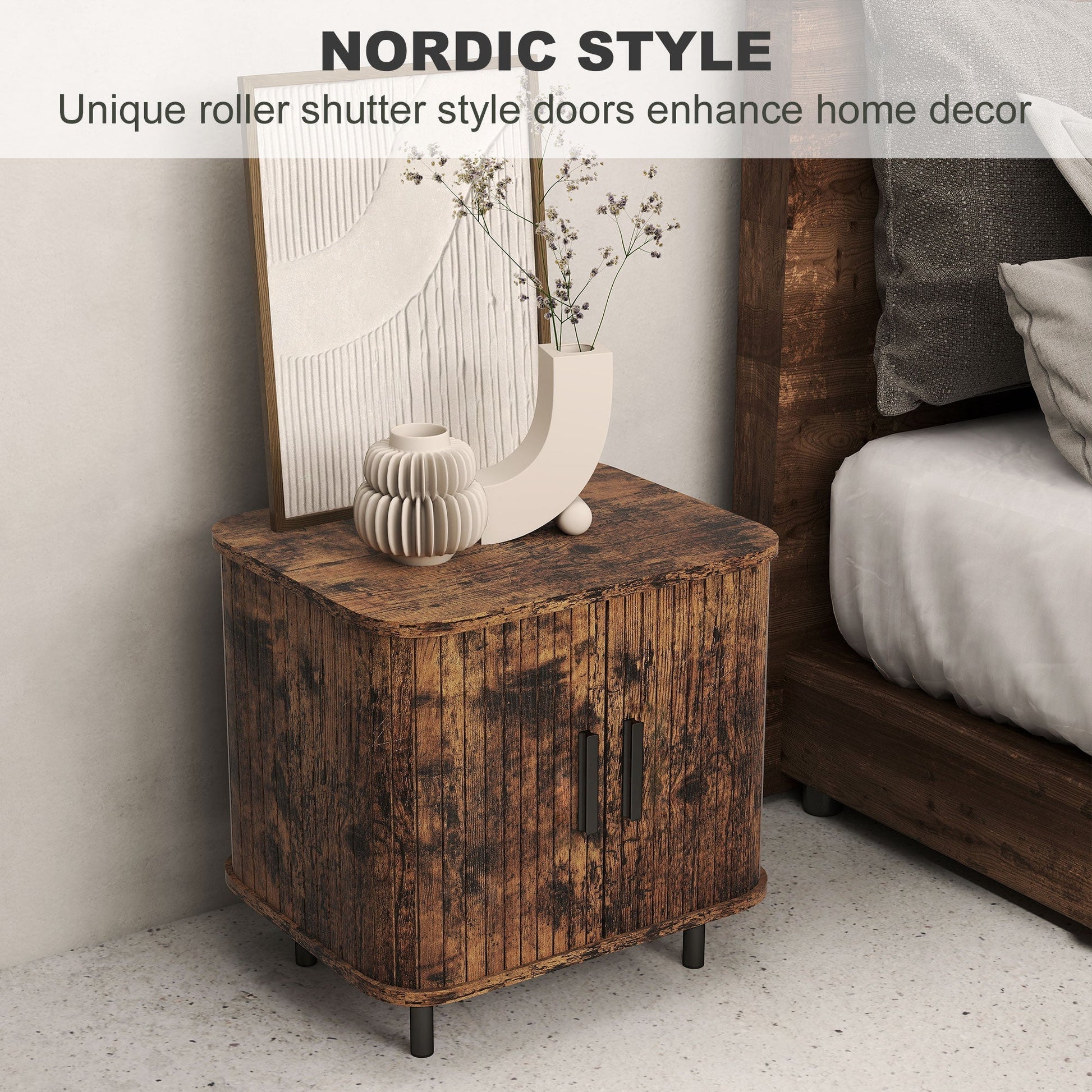 HOMCOM Bedside Table, Nordic Side Table with Roller Shutter Style Sliding Doors and Metal Legs for Bedroom, Living Room, Rustic Brown