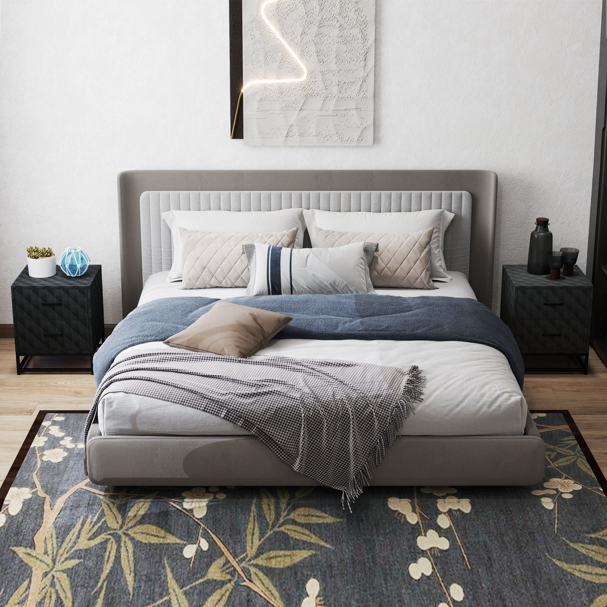 - A set of two nightstands balances bedroom décor