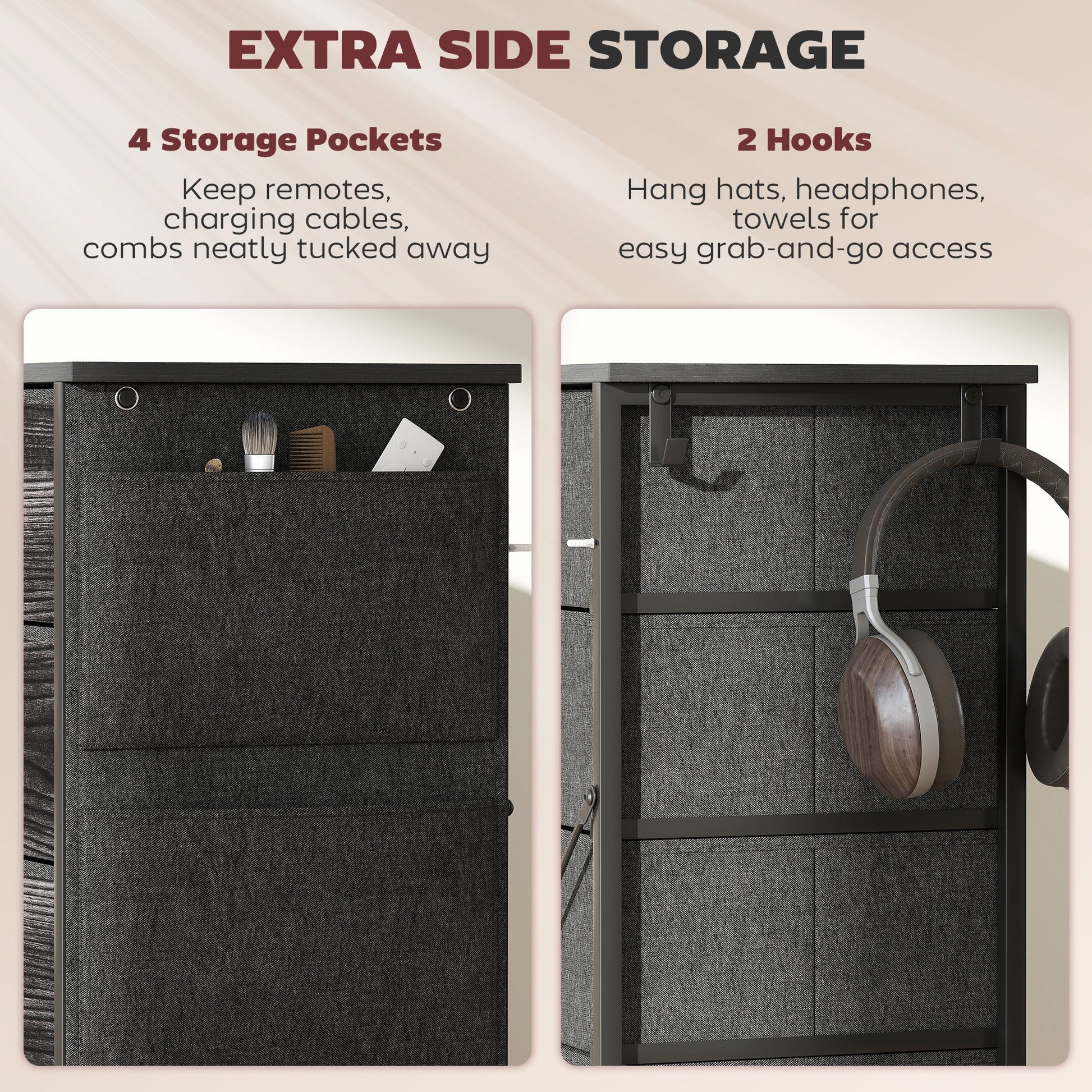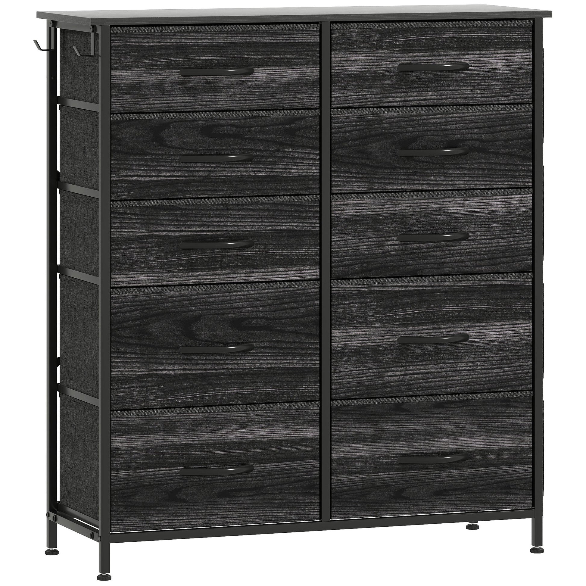 Easy, simple storage with this HOMCOM fabric chest of drawers. With six small and four large drawers, it's easy to sort everything from socks to pants. It also features four side pockets and two hooks to get smaller accessories altogether. A steel frame with X-bars keeps this bedroom dresser stable, finished with adjustable feet for balance - even on unsteady grounds.