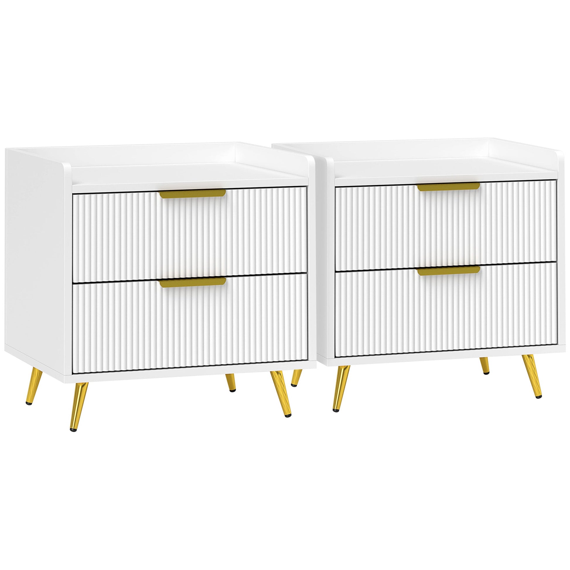 A bedroom essential, in bold and elegant style with HOMCOM nightstands. The ridged drawer fronts and gold tone handles add a beautiful touch to thes solid colour. With two drawers and a flat tabletop, with safe low-rise walls, there's lots of storage for bedtime essentials and more. Complete with a metal legs for strong support.