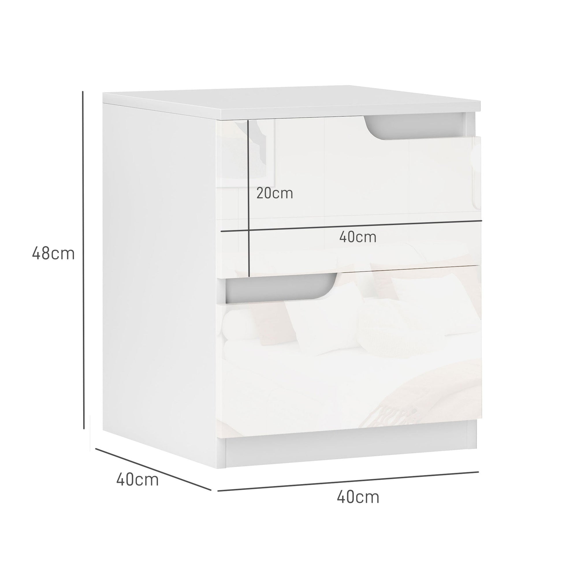 Your sleep bedtime companion - this HOMCOM nightstand. The white high-gloss finish, in a handle-less design makes it a sleek and modern addition to any room. The two drawers provide plenty of space for tucking away the essentials. Complete with foot pads to protect your floor from light damage.